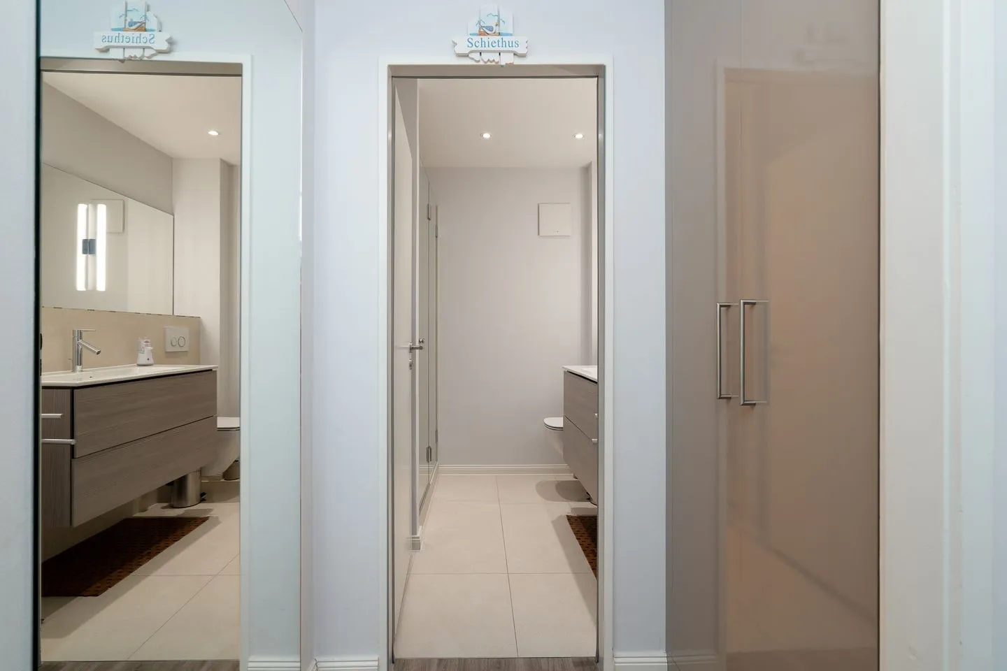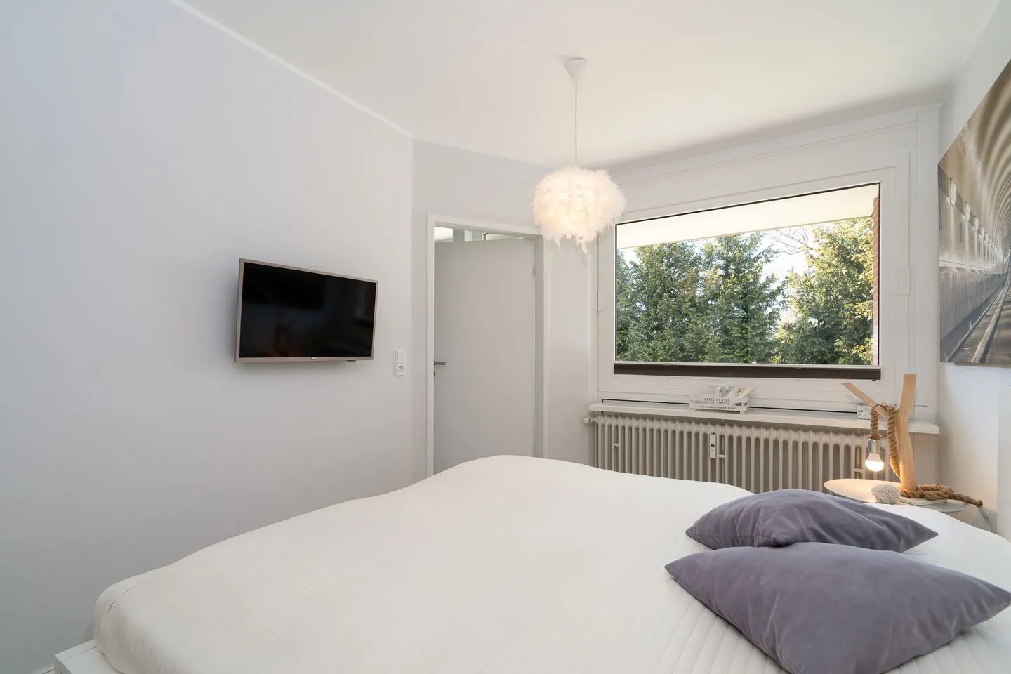 Das schicke Schlafzimmer mit zusätzlichem TV-Gerät ist auf ruhiges Schlafen ausgerichtet, mit seinem bequemen Doppelbett (180 cm x 200 cm) fördert es eine erholsame Nachtruhe. Das Sofa im Wohnbereich hat eine Schlaffunktion (160 cm x 200 cm) und bietet Platz für bis zu zwei Personen. Die Ferienwohnung verfügt über ein modernes Badezimmer, das mit einer Dusche, einem Haartrockner, Waschbecken und WC ausgestattet ist.