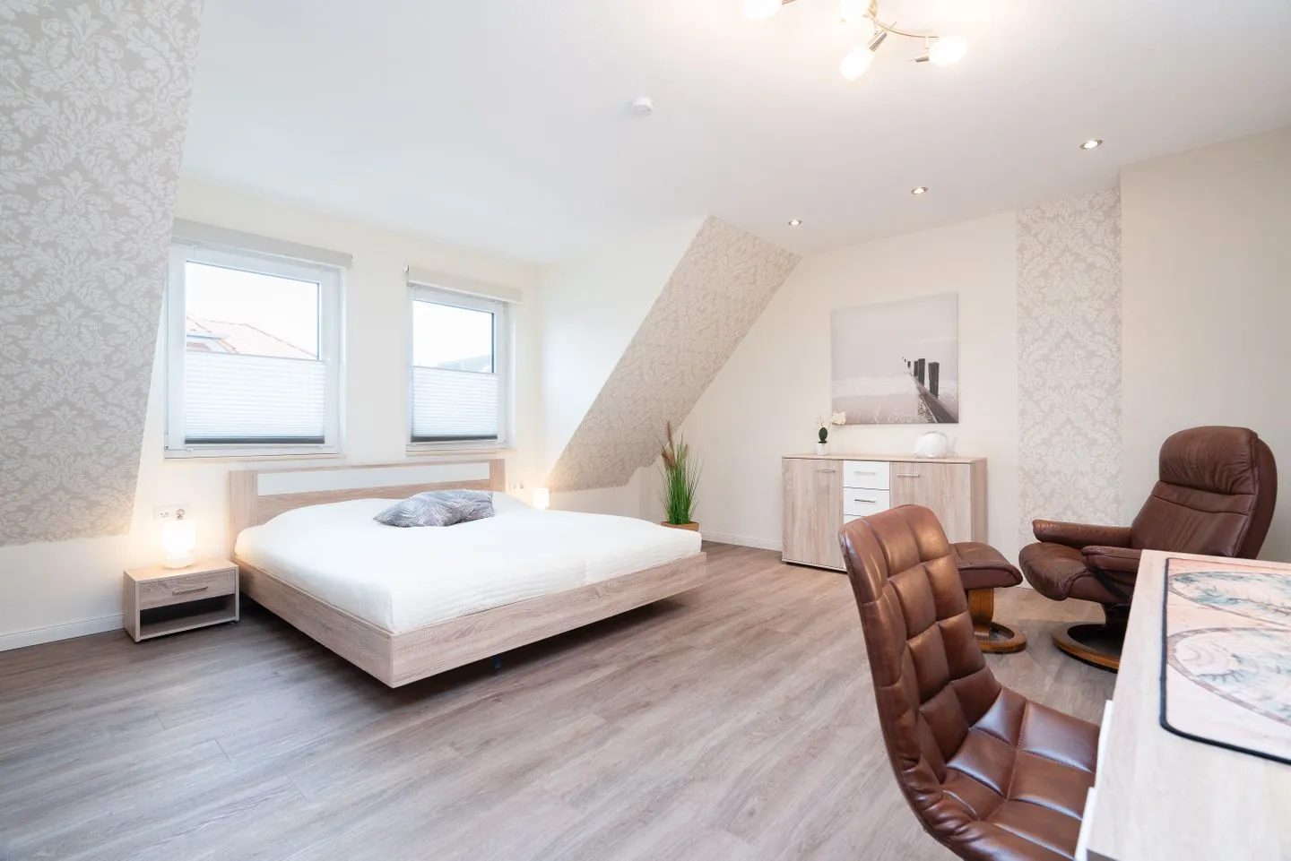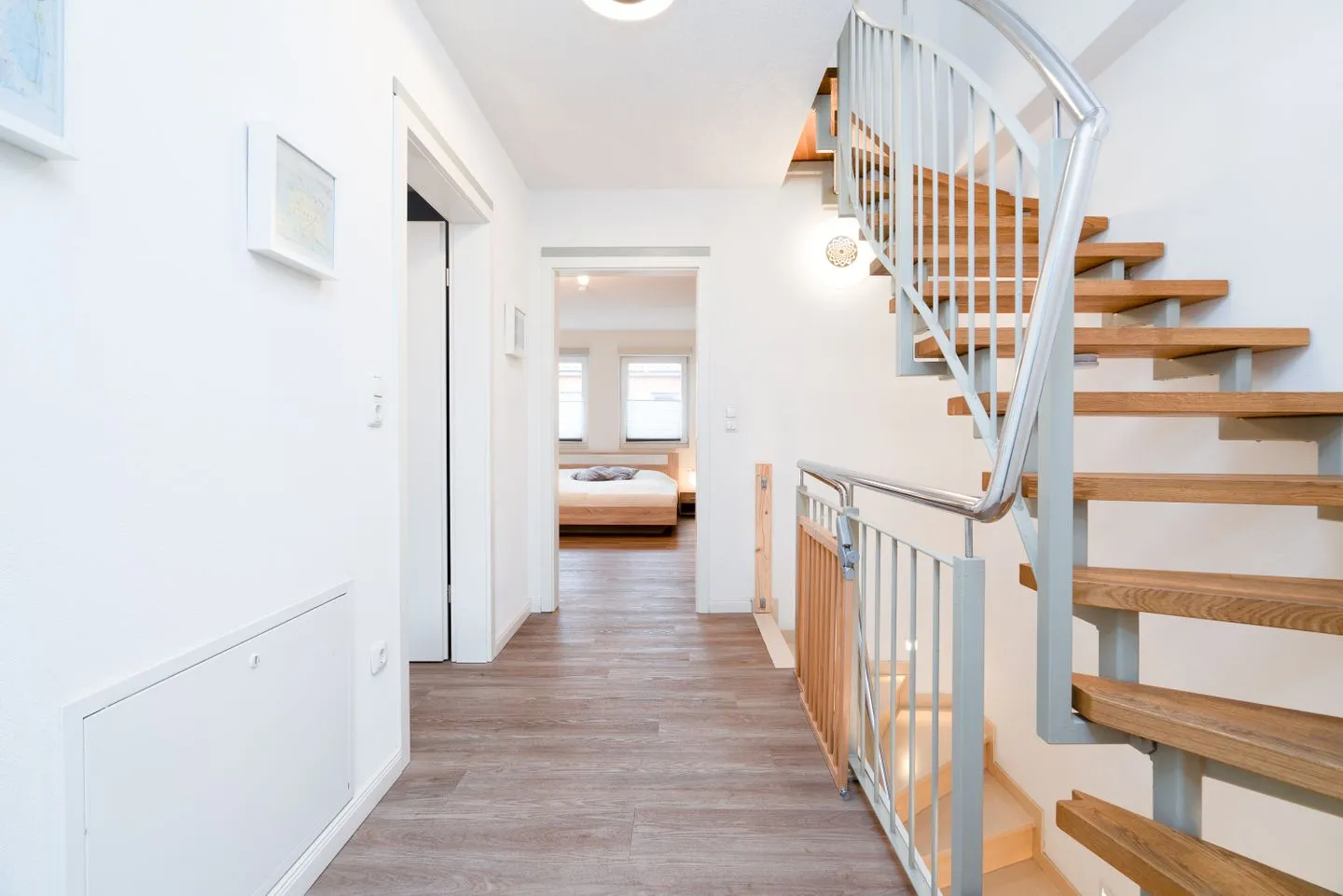 hier steht Ihnen eine ganz neu gestaltete Doppelhaushälfte im Zentrum der Stadt zur Verfügung. Über 3 Etagen teilen sich 3 Schlafräume (1 Schlafraum mit 2 Tandembetten für 1-2 Personen, 1 Schlafraum mit Doppelbett mit offenem Fußende, 1 Schlafbereich unterm Dach mit Einzelbett für 1 Person) , 2 Duschbäder (1 x im 1. OG und 1 x mit einer Infrarotsauna im 2. OG), die offene, moderne Küche mit Essbereich, der großzügige Wohnraum mit großer Schlafcouch und Gaskamin, sowie Zugang zur Terrasse und dem Gartenanteil auf. Im Eingangsbereich befindet sich noch ein Gäste-WC. Es gibt einen kleinen Haushaltsraum mit Trockner und Waschmaschine, die nach Münzeinwurf benutzt werden können. WLAN inklusive.