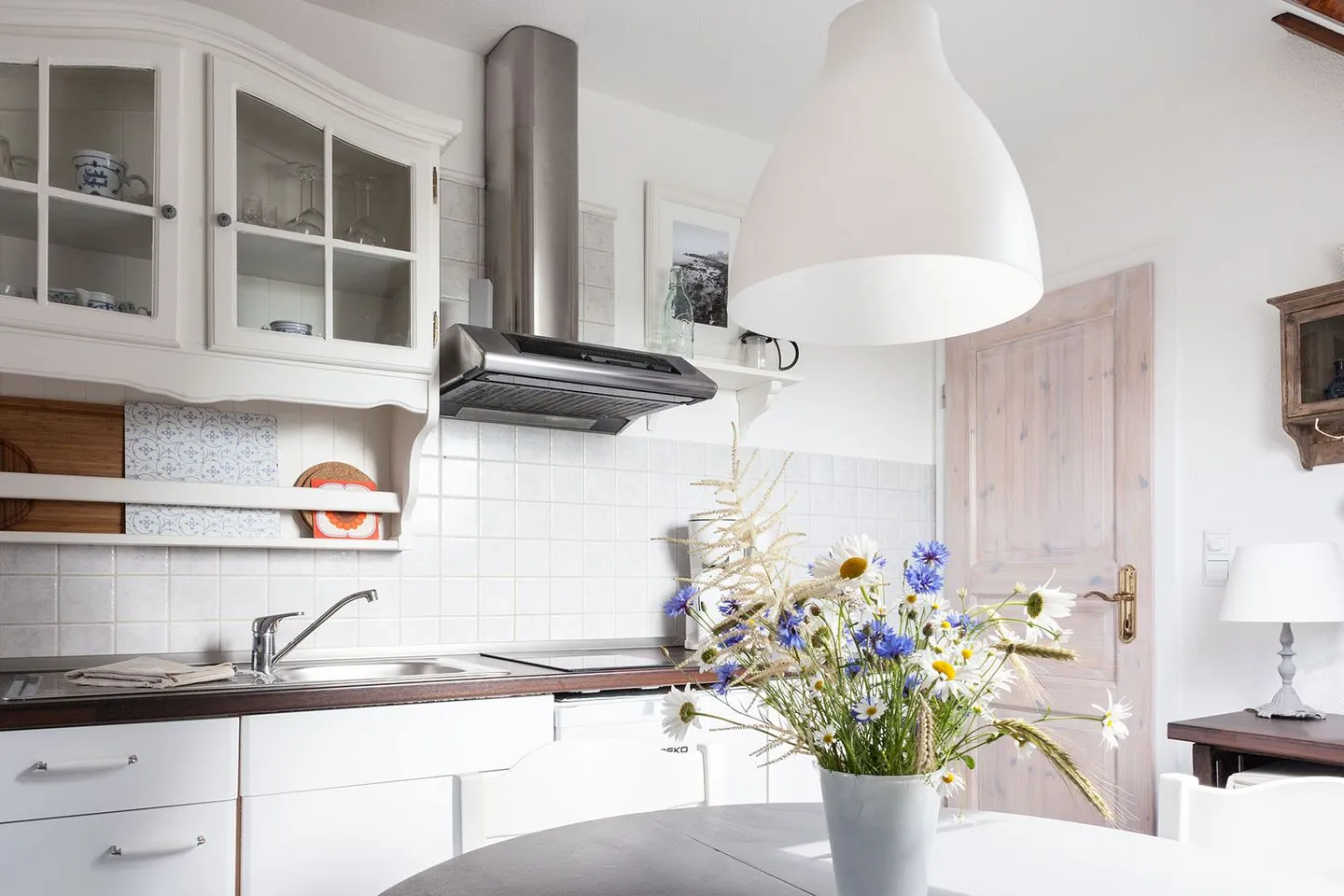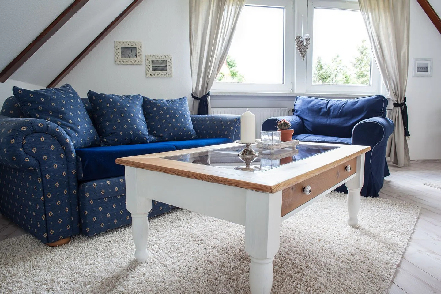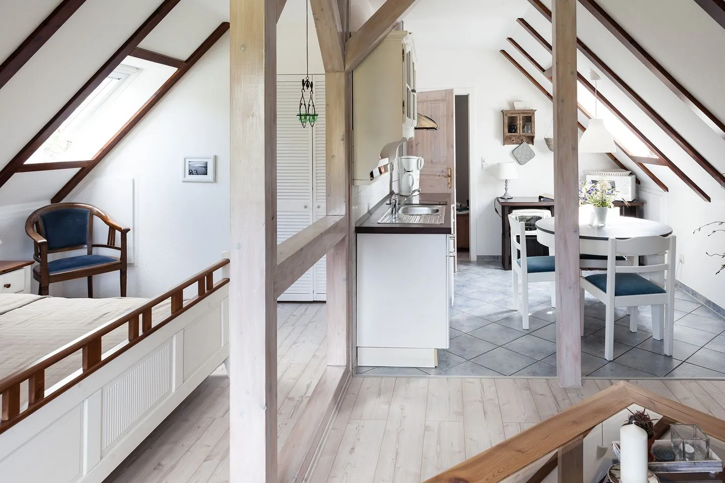 Der Wohnbereich ist offen gestaltet und verbindet Wohnen, Essen und Kochen in einem harmonischen Raumkonzept. Helle Farben, sichtbare Dachbalken und geschmackvolle Möbel im Landhausstil schaffen eine warme und einladende Wohnatmosphäre. Eine komfortable Sofaecke sowie Smart-TV und WLAN sorgen für entspannte Stunden.