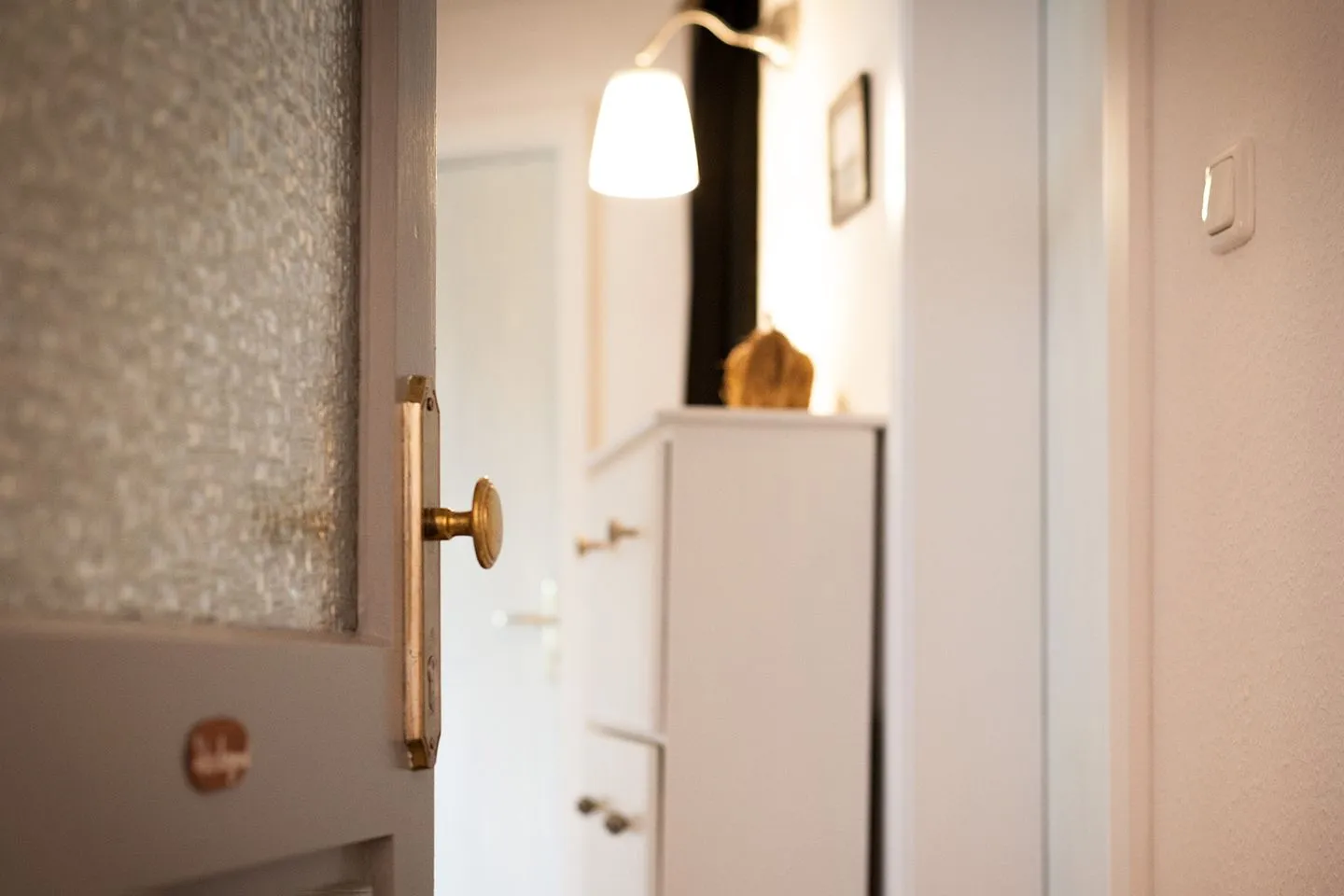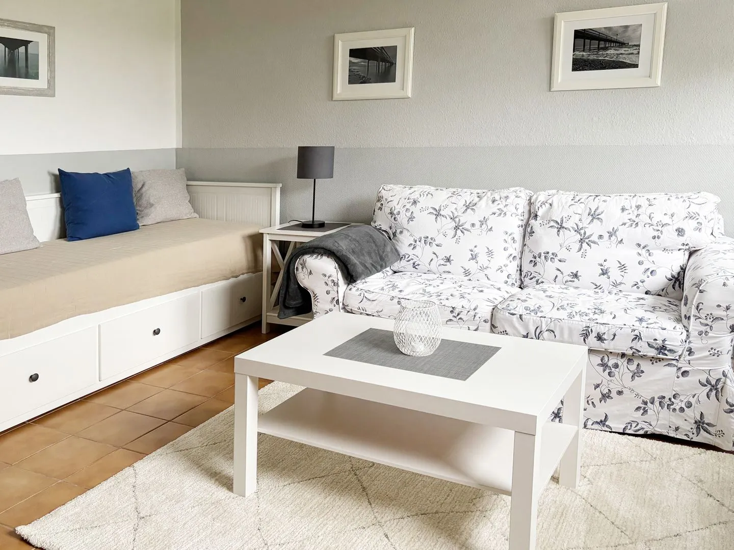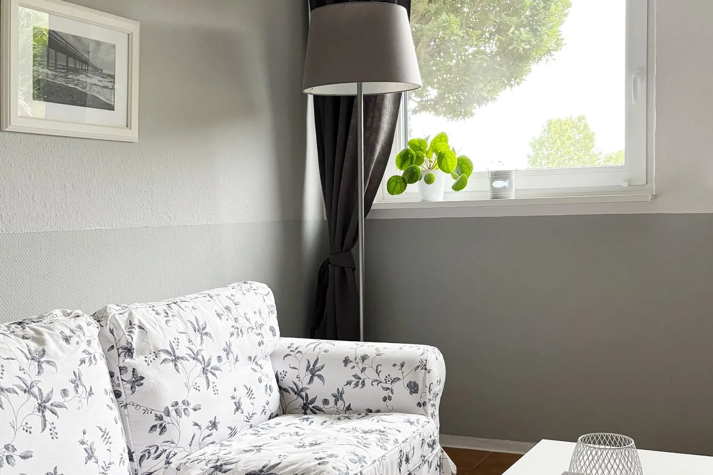 Der Wohnbereich präsentiert sich hell und freundlich mit einem gemütlichen Sofa und Smart-TV. Große Fenster sorgen trotz der Lage im Souterrain für ausreichend Tageslicht. Die gepflegte Einrichtung im Landhausstil sorgt mit liebevollen Details für eine angenehme Wohlfühlatmosphäre. Zur Unterkunft gehört eine möblierte Terrasse, die einen schönen Blick ins Grüne bietet – ideal für entspannte Stunden im Freien.