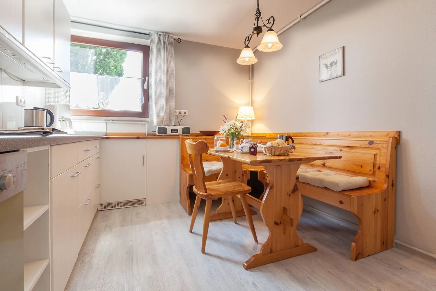 Die separate Küche verfügt über einen Essbereich mit gemütlicher Eckbank und ist funktional ausgestattet mit Cerankochfeld (2-Platten), kleinem Backofen, Mikrowelle sowie einem großzügigen Kühlschrank mit integriertem Gefrierschrank. Hier finden Sie alles, was Sie für die Zubereitung Ihrer Mahlzeiten benötigen.