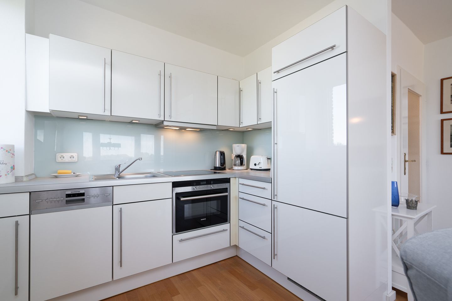 Die offen zum Wohnzimmer gestaltete Küche ist mit Backofen und Herd ausgestattet, sowie umfangreichen Küchenutensilien wie Kaffeemaschine, Wasserkocher, Toaster sowie Geschirr und Besteck. Das Badezimmer bietet eine Dusche mit Wanne, Waschbecken, Spiegel und WC.