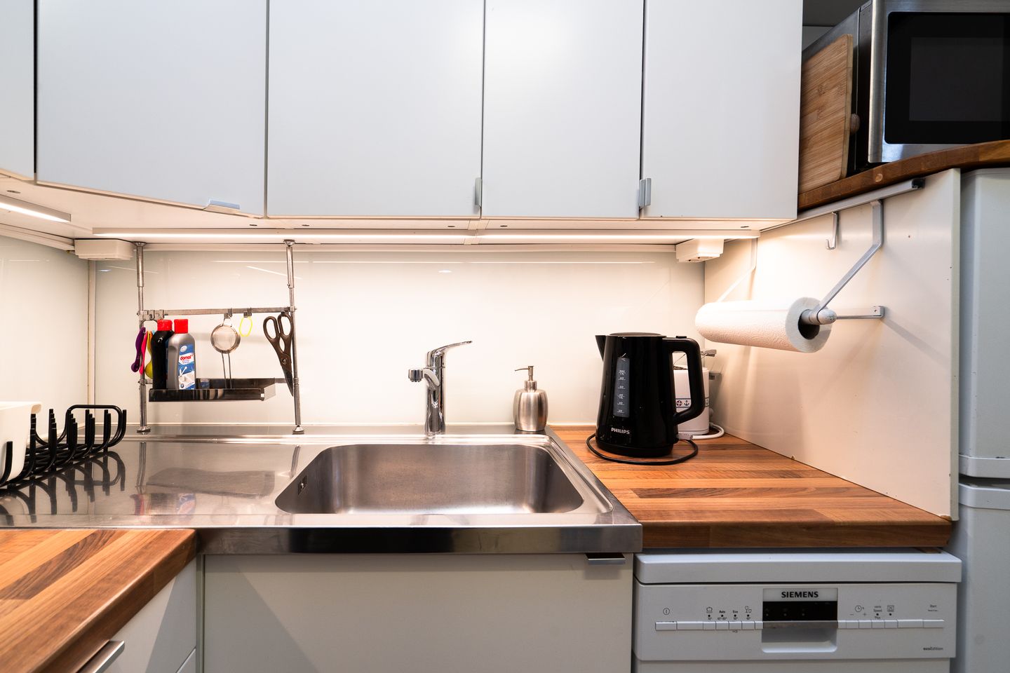 Die separate Küche ist vollständig ausgestattet und verfügt über Annehmlichkeiten wie Kühlschrank, Geschirrspüler, und Mikrowelle – ideal für eine unkomplizierte Selbstversorgung während Ihres Aufenthalts. Das Badezimmer ist mit Dusche (Viertelkreisdusche mit Radius 75 cm), Waschbecken, beheizbarem Handtuchhalter und WC ausgestattet, ein Haartrockner steht ebenfalls zur Verfügung. Ein Waschtrockner im Bad erledigt mit Leichtigkeit die Urlaubswäsche.