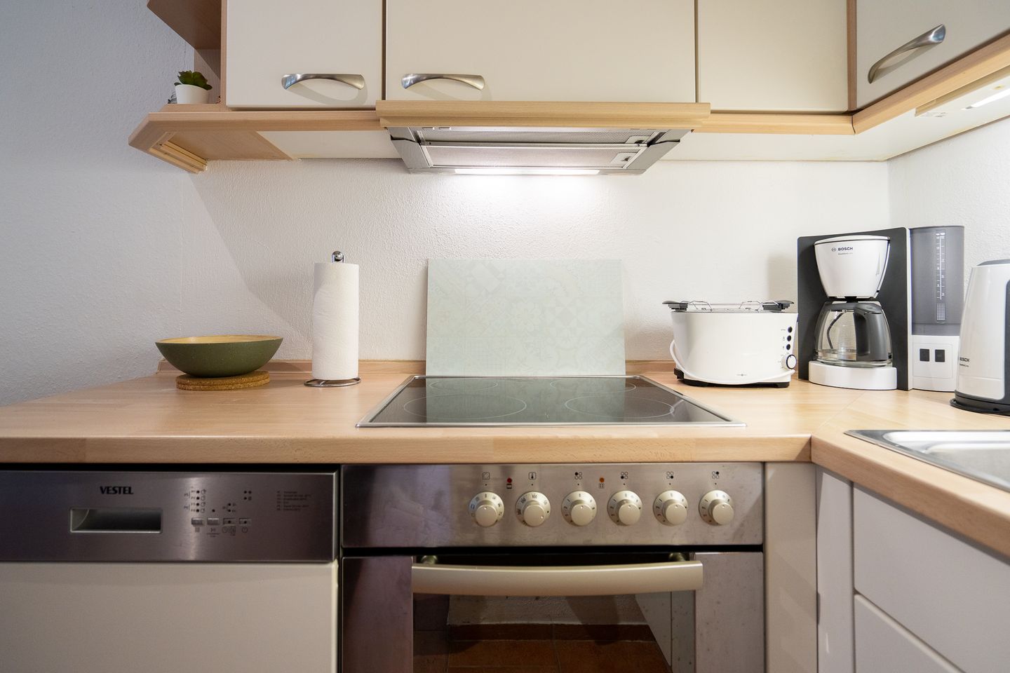 Die offen zum Wohnbereich gestaltete Küche ermöglicht eine flexible Selbstversorgung während Ihres Urlaubs. Der angrenzende Essbereich eignet sich ideal für gemeinsame Mahlzeiten, Spieleabende oder als Arbeitsplatz. WLAN steht Ihnen in der gesamten Ferienwohnung kostenfrei zur Verfügung. Für entspannte Abende bietet die Ferienunterkunft einen TV und weitere komfortable Ausstattungsmerkmale.