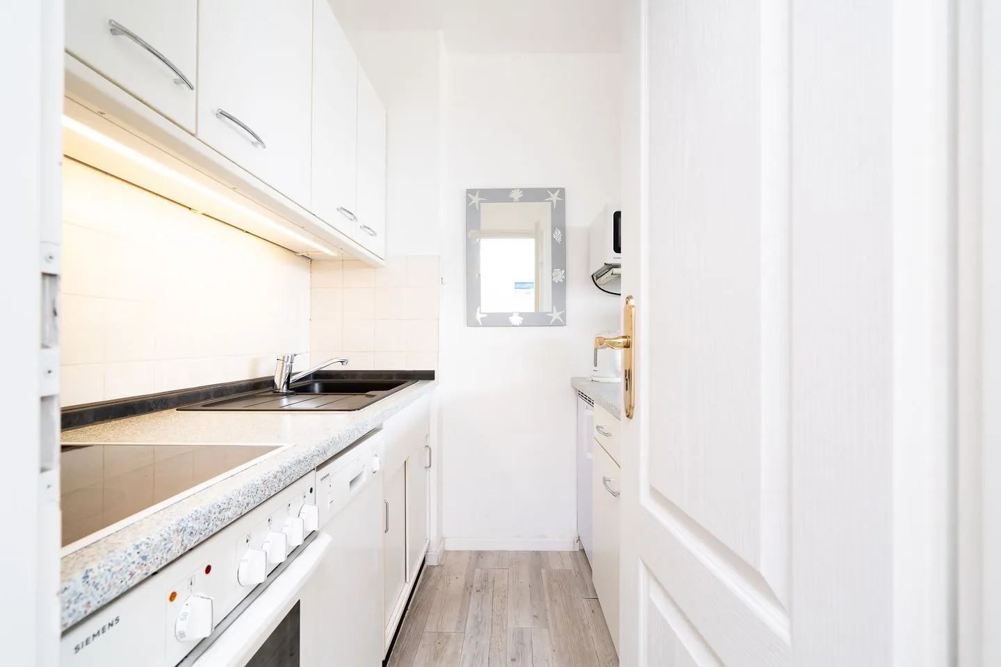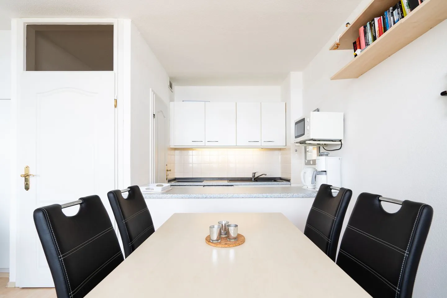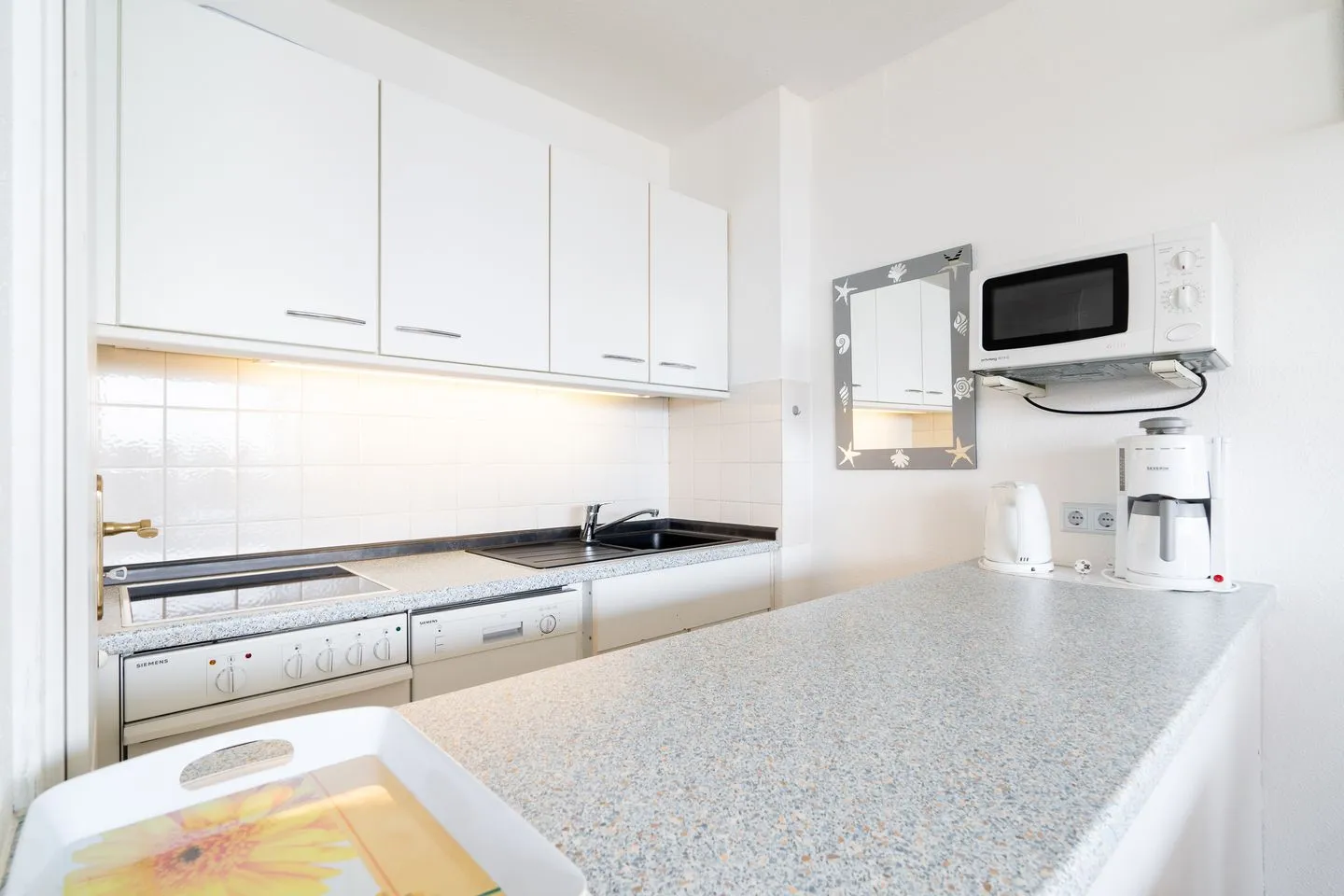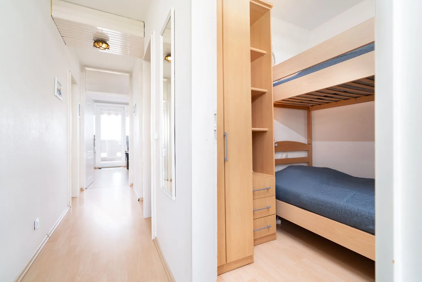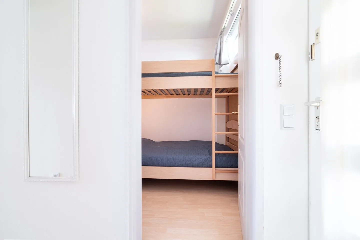 Herzlich willkommen in der 3-Raum-Ferienwohnung Nr. 106. Die Ferienwohnung liegt in der 2. Etage der 1. Reihe der Terrassenhäuser und hat einen wunderbaren Meerblick. Die Wohnung ist für bis zu 4 Personen geeignet und ist der perfekte Ort für einen erholsamen Familienurlaub. Vom kombinierten Wohn- und Essbereich gelangen Sie auf den Balkon mit Markise in Süd-Ost-Lage. Die Küche ist mit Spülmaschine, Herd und Backofen ausgestattet und zum Wohn- und Essbereich hin offen. im ersten Schlafraum steht ein Doppelbett (2x 80 x 195 cm), im zweiten Schlafraum ein Etagenbett (jeweils 85 x 195 cm). Das Duschbad ist innenliegend. Ohne eine Straße zu überqueren sind es zum Strand nur wenige Fußschritte. Der PKW-Stellplatz liegt in Wohnungsnähe und ist inklusive.