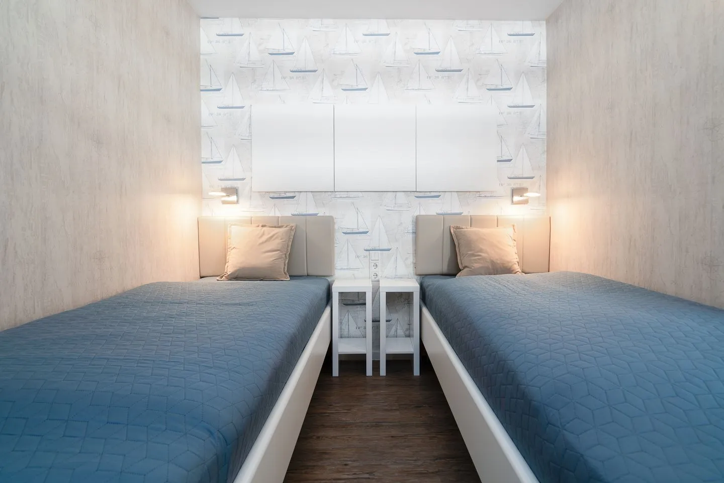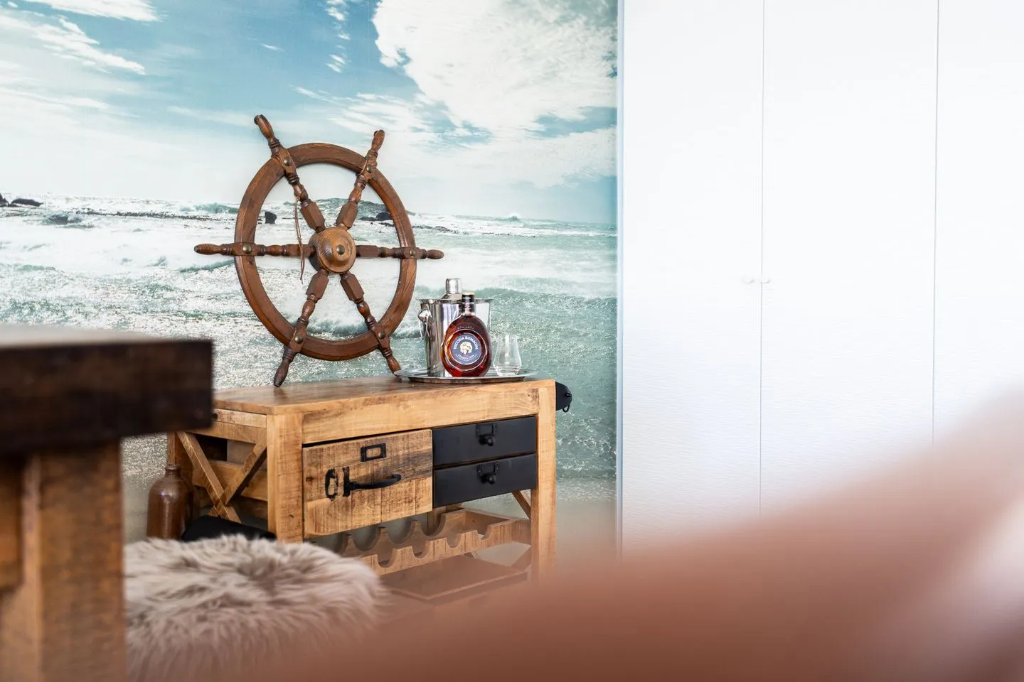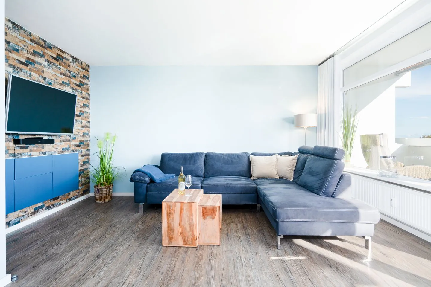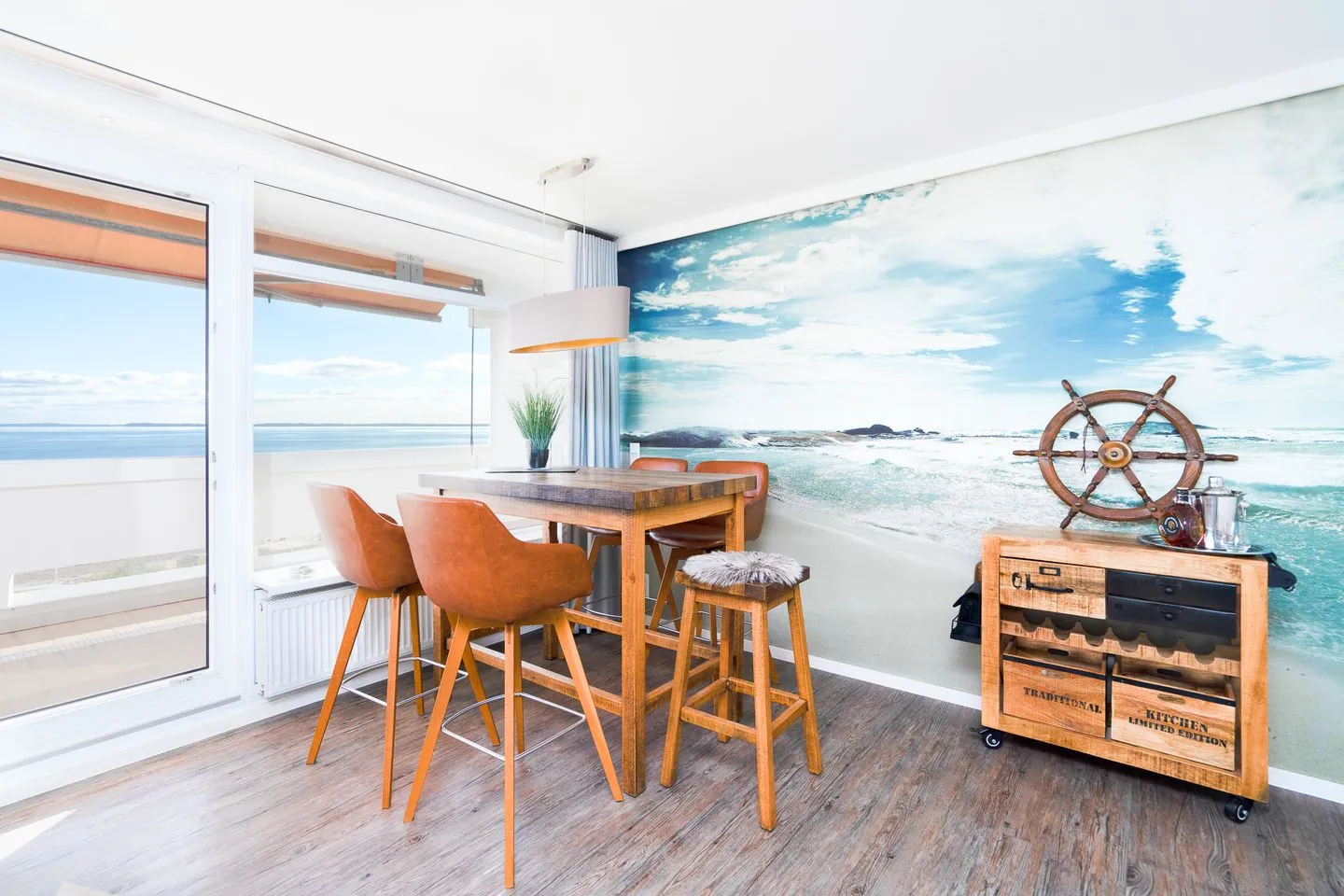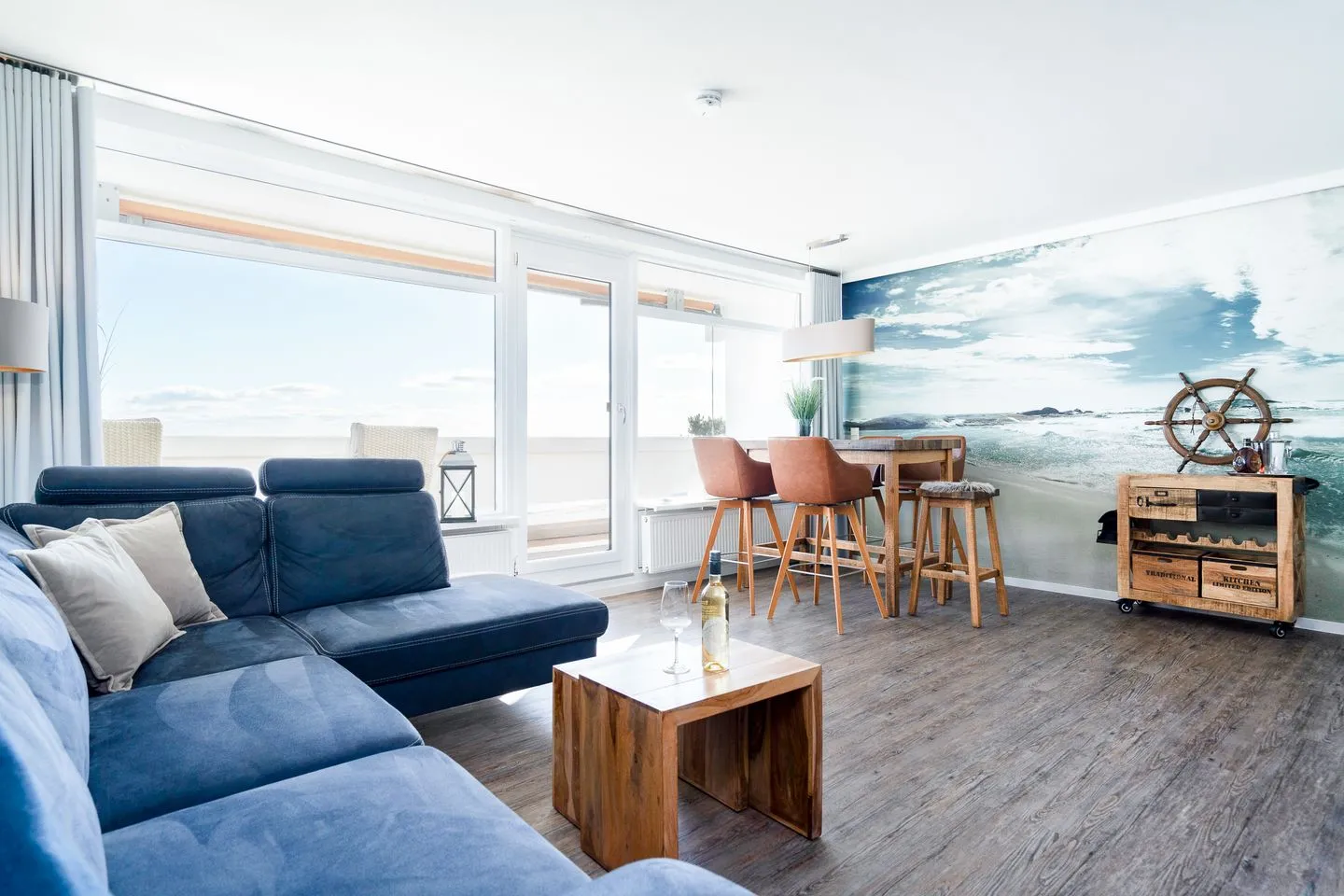 in der 1. Reihe zum Meer in der 2. Etage (Eingang 1. Etage) der Terrassenhäuser liegt diese top-moderne 2-Zimmer-Ferienwohnung für 2 Personen. Mit ihrem maritimen Charme bietet sie einen Erholungsort in einem wunderbaren Wohlfühlambiente. Der Balkon mit Markise in Süd-Ost-Lage bietet 100% Meerblick, genießen Sie in den gemütlichen Lounge-Stühlen den tollen Blick aufs Wasser und Meeresrauschen pur. Vom gemütlichen Wohn- und Essbereich mit maritimen Flair haben Sie Zugang zum Balkon. Insektenschutzgitter vor der Balkontür und den Fenstern sorgen dafür, dass die Mücken draußen bleiben und Sie auf der bequemen Sofalandschaft entspannen und die Seele baumeln lassen können. Die separate Küche ist klein, aber hochwertig mit Spülmaschine, Herd und Backofen voll ausgestattet. Im Schlafraum mit zweiten TV stehen zwei komfortable Einzelbetten (je 80 cm x 195 cm). Das moderne Duschbad ist hell und innenliegend. Zum sanft abfallenden Sandstrand sind es nur wenige Gehminuten, es muss keine Straße überquert werden. Ein PKW-Stellplatz direkt vor der Tür ist inklusive.
