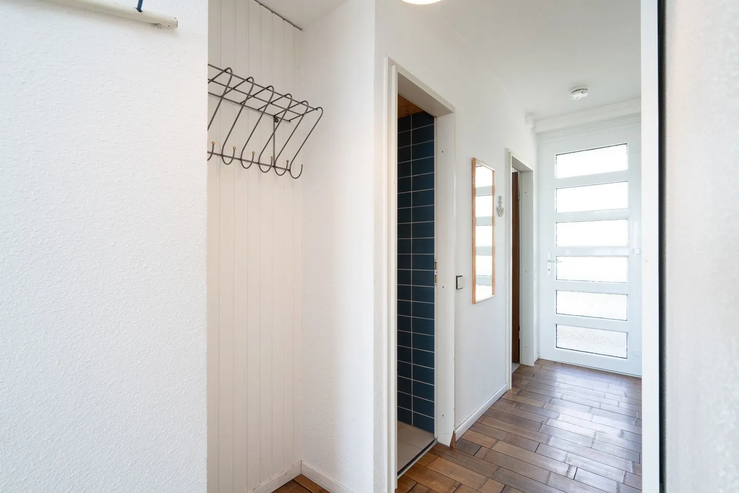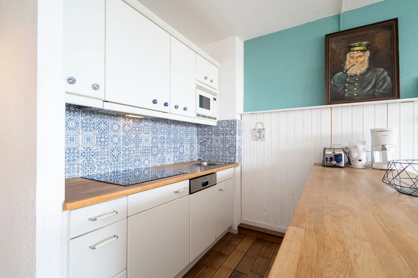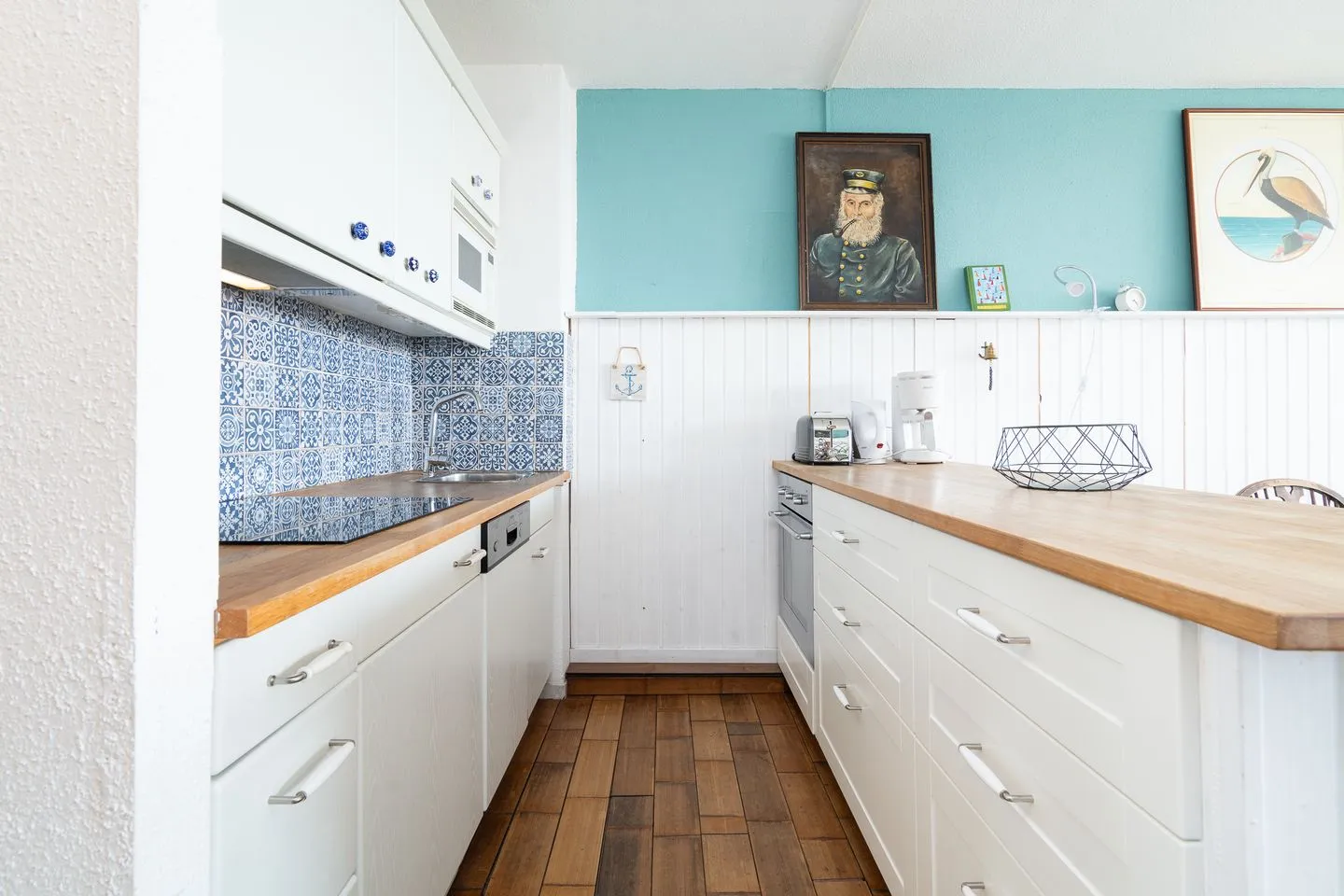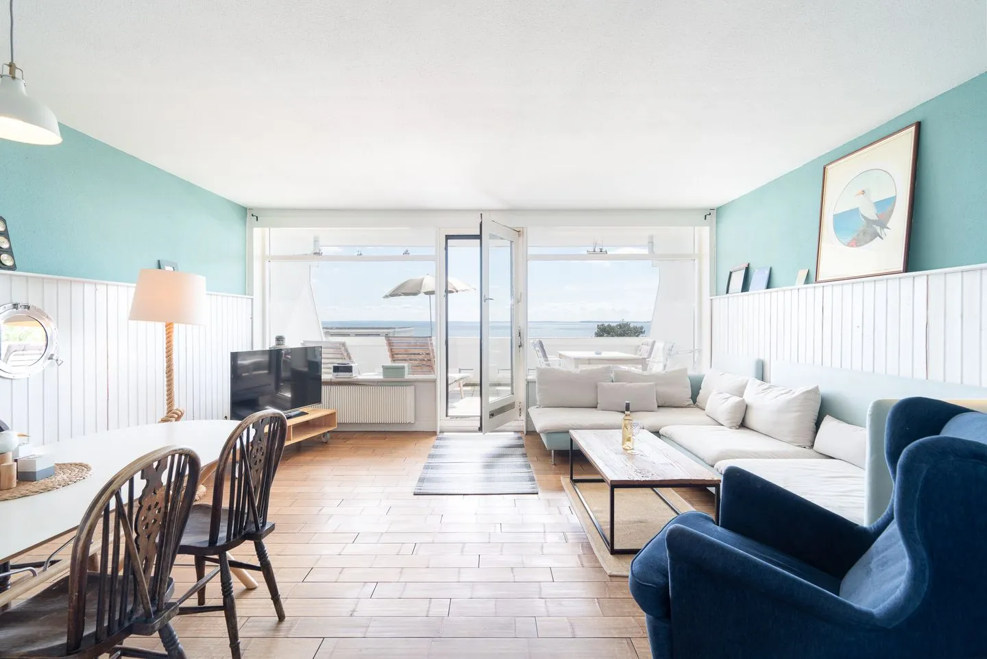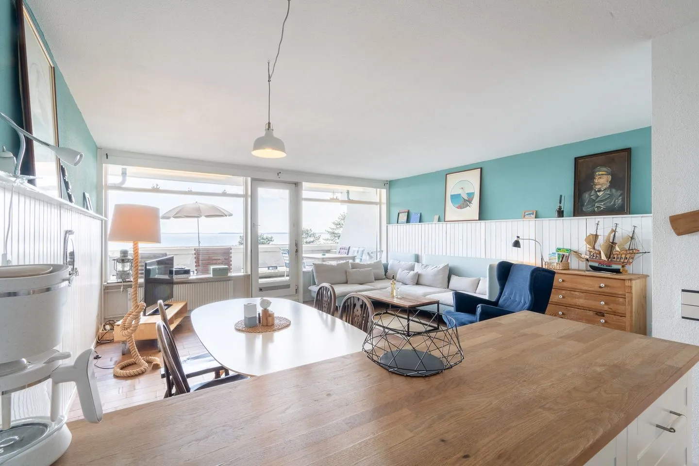 Diese helle und schöne 3-Raum-Ferienwohnung ist ein wunderbares Feriendomizil für die ganze Familie. Vom Balkon aus haben Sie einen schönen Blick auf die Ostsee über die erste Reihe der Flachbauten hinweg. Der gemütliche Wohn- und Essbereich mit Esstisch und Sofaecke strahlt mit seiner stimmigen Einrichtung mit maritimen Elementen und dem hochwertigen Parkettboden Behaglichkeit und Wohlfühlatmosphäre aus. Die moderne Küche ist mit Spülmaschine, Herd und Mikrowelle ausgestattet und zum Wohn- und Essbereich offen. Im ersten Schlafzimmer steht ein komfortables Doppelbett (2x 80 x 200 cm), im zweiten ein Etagenbett (jeweils 90 x 185 cm). Das Duschbad ist innenliegend. Ohne eine Straße zu überqueren sind es zum Strand nur wenige Fußschritte. PKW-Stellplatz inklusive.