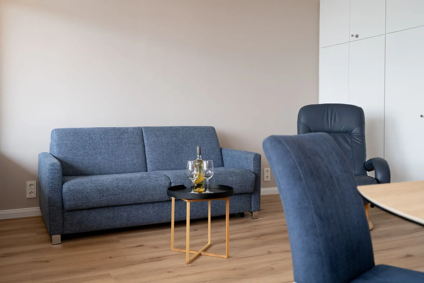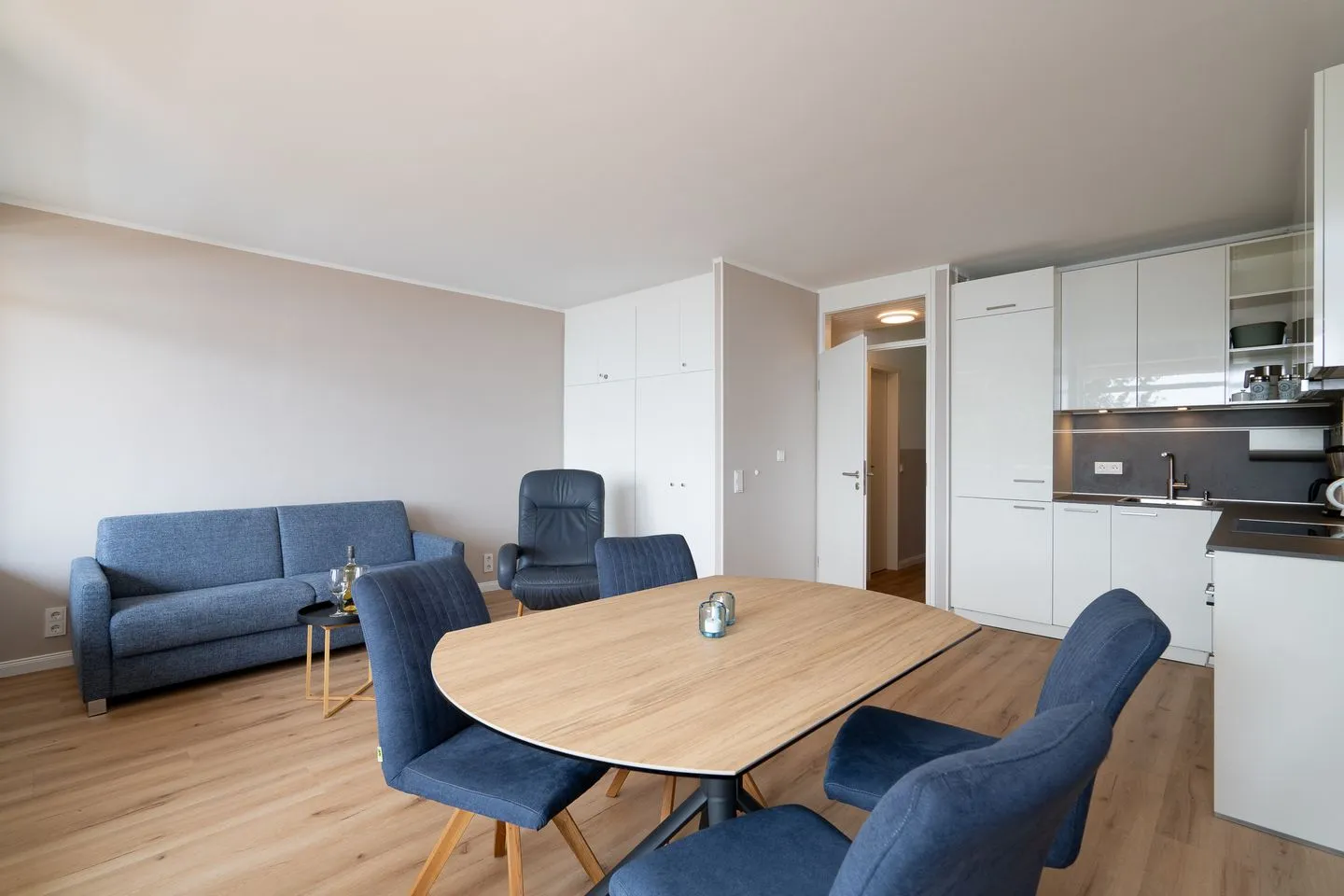 Das lichtdurchflutete Wohnzimmer verfügt über eine hochwertige und komfortable Schlafcouch (ausziehbar, 140 cm x 200 cm), einen Sessel und einen großzügigen Essbereich. Die offene und moderne Küche mit Backofen, Herd und Spülmaschine ist nahtlos ins Wohnkonzept integriert und ist bestens ausgestattet, um sich im Urlaub selbst versorgen zu können