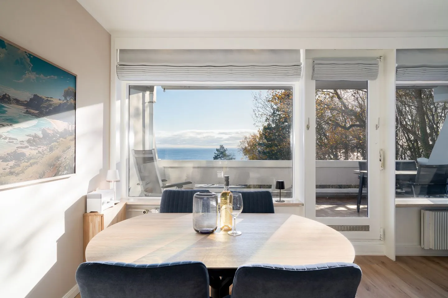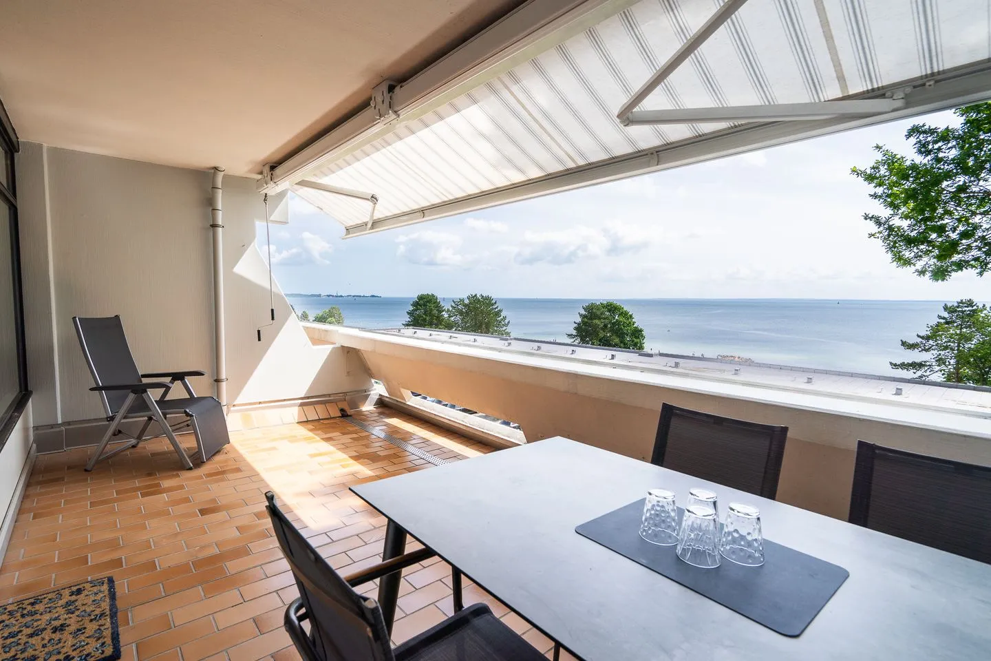 Ein besonderes Highlight ist die überdachte Terrasse mit Markise, auf der Sie den schönen Meerblick genießen können. Gartenmöbel stehen bereit, sodass Sie entspannte Stunden im Freien verbringen können.