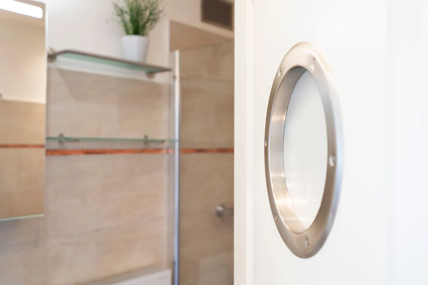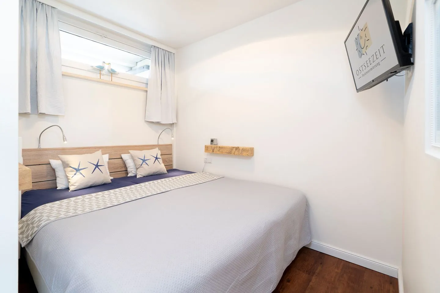Die moderne Küche ist mit Spülmaschine, Backofen und Herd voll ausgestattet und in den kombinierten Wohn- und Essbereich integriert. Der Schlafraum mit Oberlicht ist mit einem gemütlichen Doppelbett (2x 90 cm x 200 cm) ausgestattet und hat ein zusätzliches TV-Gerät. Viel Stauraum bietet das separate Ankleidezimmer. Der geschmackvoll und freundlich eingerichtete Wohn- und Essbereich ist zudem mit einem Schlafsofa ausgestattet (Liegefläche 120 cm x 200 cm). Das moderne Badezimmer ist innenliegend und hat eine bodentiefe Dusche.