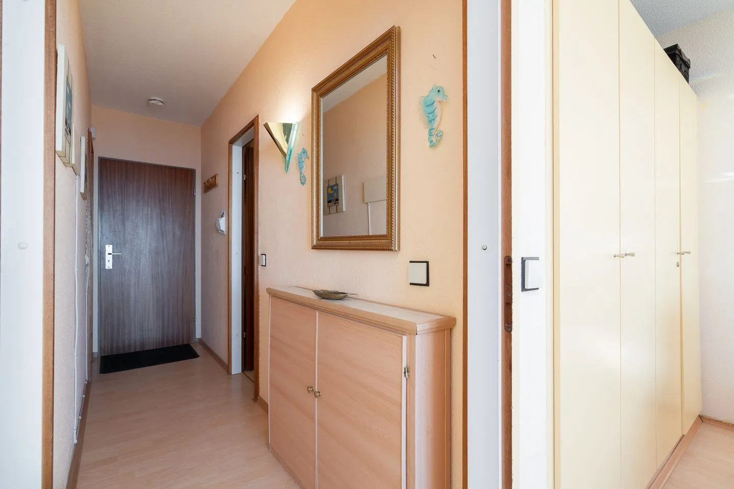 die Wohnung befindet sich im Hochhaus in der 3. Etage mit Balkon in Süd-Ost-Lage und wunderbarem Ostseeblick. Vom kombinierten Wohn- und Essbereich haben Sie Zugang zum Balkon. Die kleine Küchenzeile ist zum Wohn-/Essbereich mit einer Durchreiche hin offen und mit Backofen, Herd und Mikrowelle ausgestattet. Im innenliegenden Schlafraum befinden sich zwei Einzelbetten (jeweils 90 cm x 190 cm), die man nicht zusammenschieben kann. Im Schlafraum ist kein Platz, um ein Kinderreisebettchen aufzustellen. Eine weitere Schlafmöglichkeit bietet das Schlafsofa im Wohnbereich. Das Duschbad ist innenliegend. Ohne eine Straße überqueren zu müssen, ist der Strand in wenigen Schritten zu erreichen. PKW-Stellplatz im Parkdeck, es führen Treppen von dort aus zur Wohnung. Über einen Seiteneingang gelangt man zum Fahrstuhl für ebenerdiges Be-und Entladen.