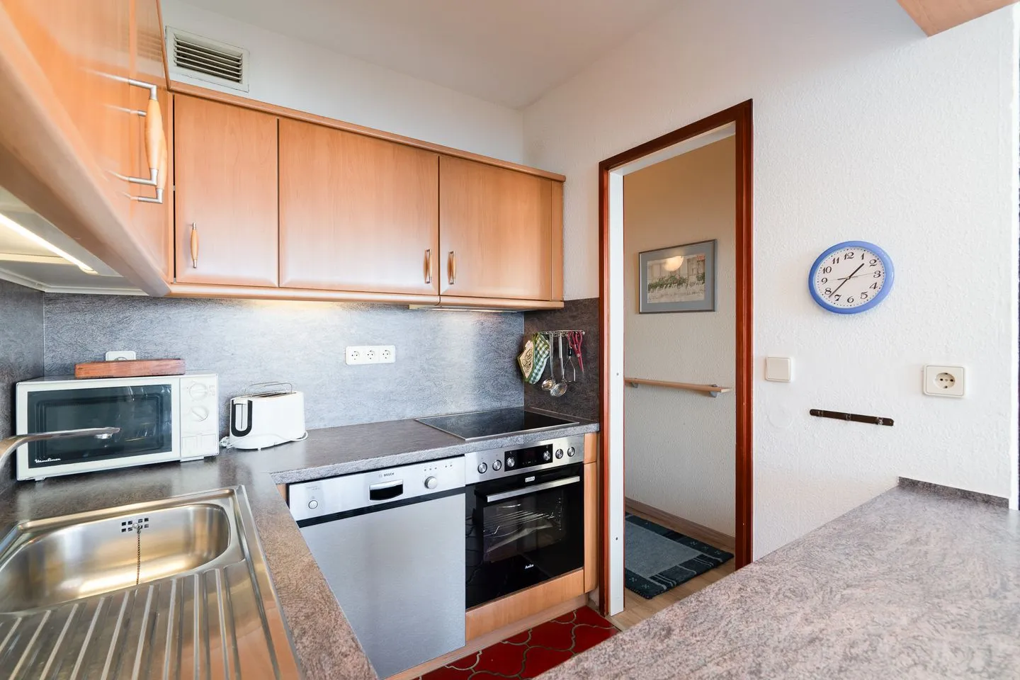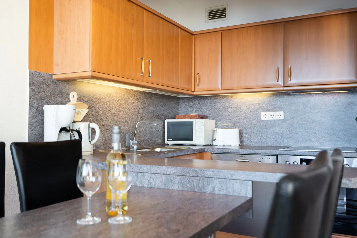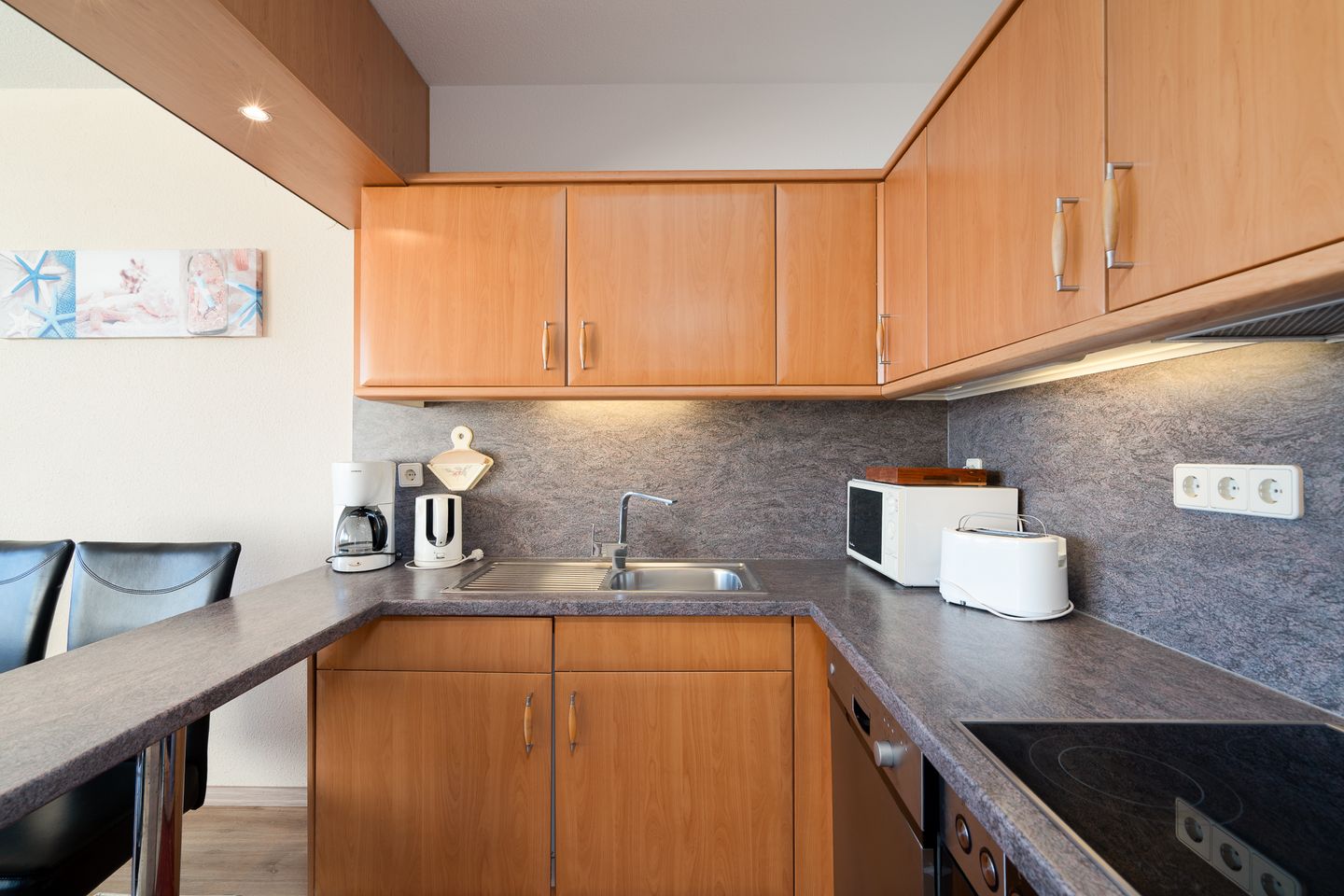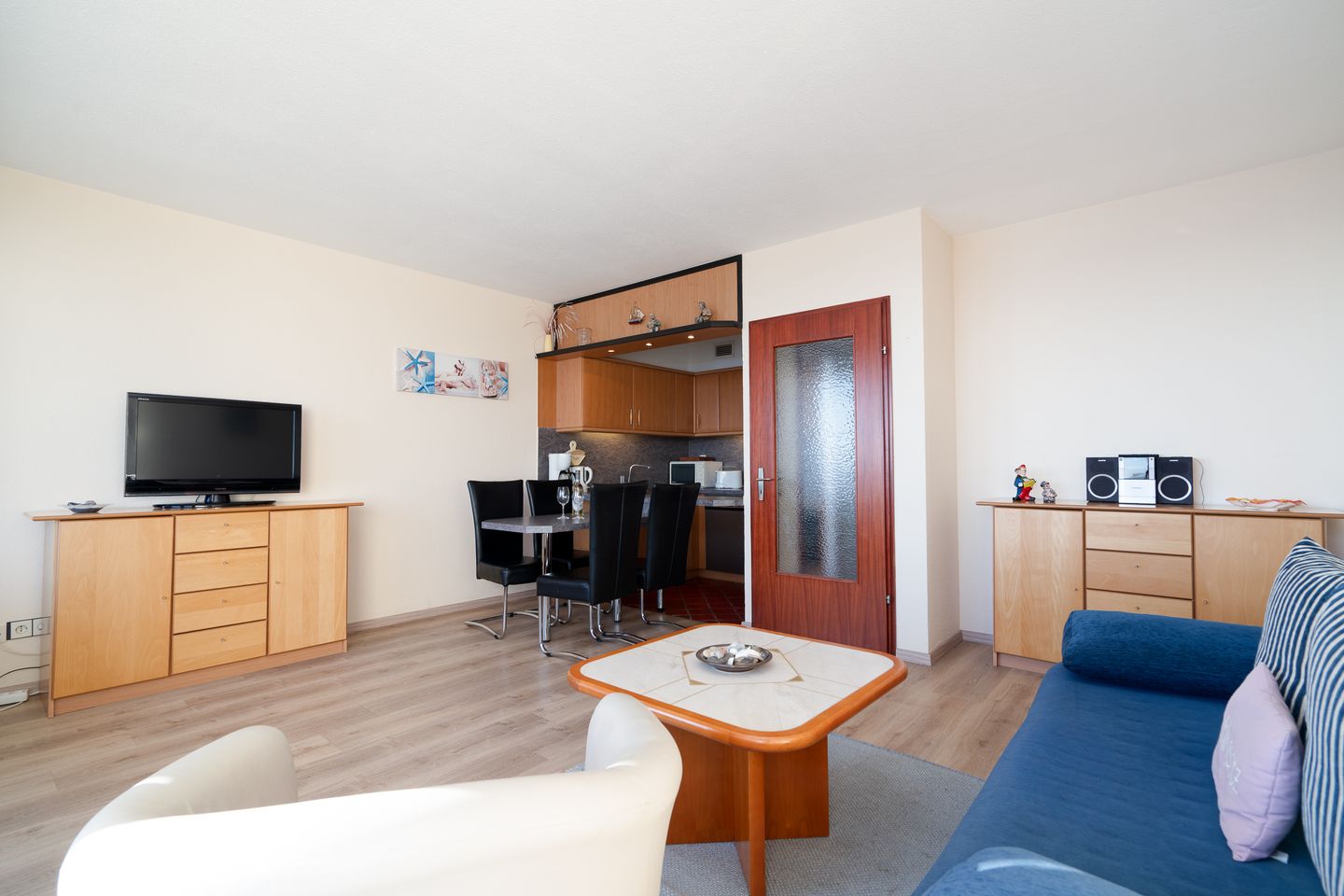 Vom kombinierten Wohn- und Essbereich haben Sie Zugang zum Balkon in Süd-Ost-Lage mit wunderschönem Ostseeblick. Die mit Spülmaschine, Backofen und Herd ausgestattete Küche ist in den Wohn-/Essbereich integriert. Das Schlafzimmer ist mit einem Doppelbett ausgestattet, im Wohnraum steht ein Schlafsofa. Das modernisierte Duschbad ist innenliegend.