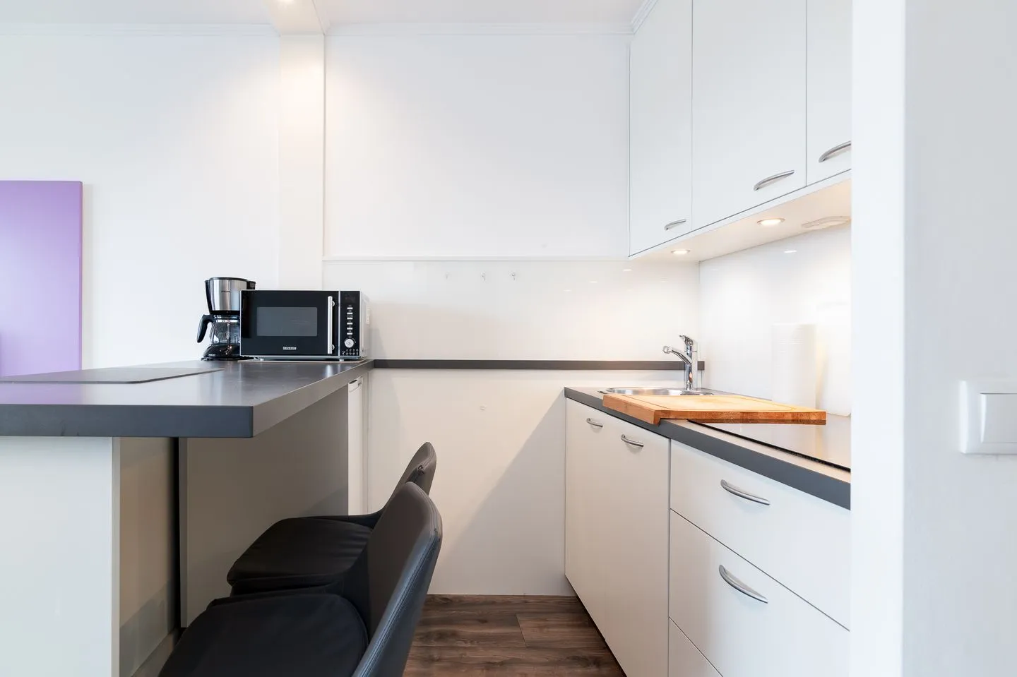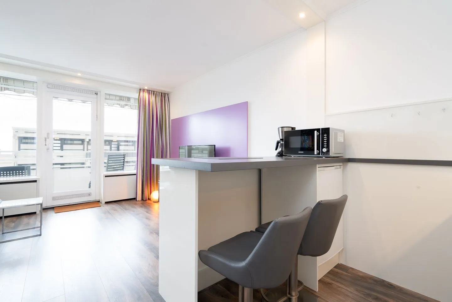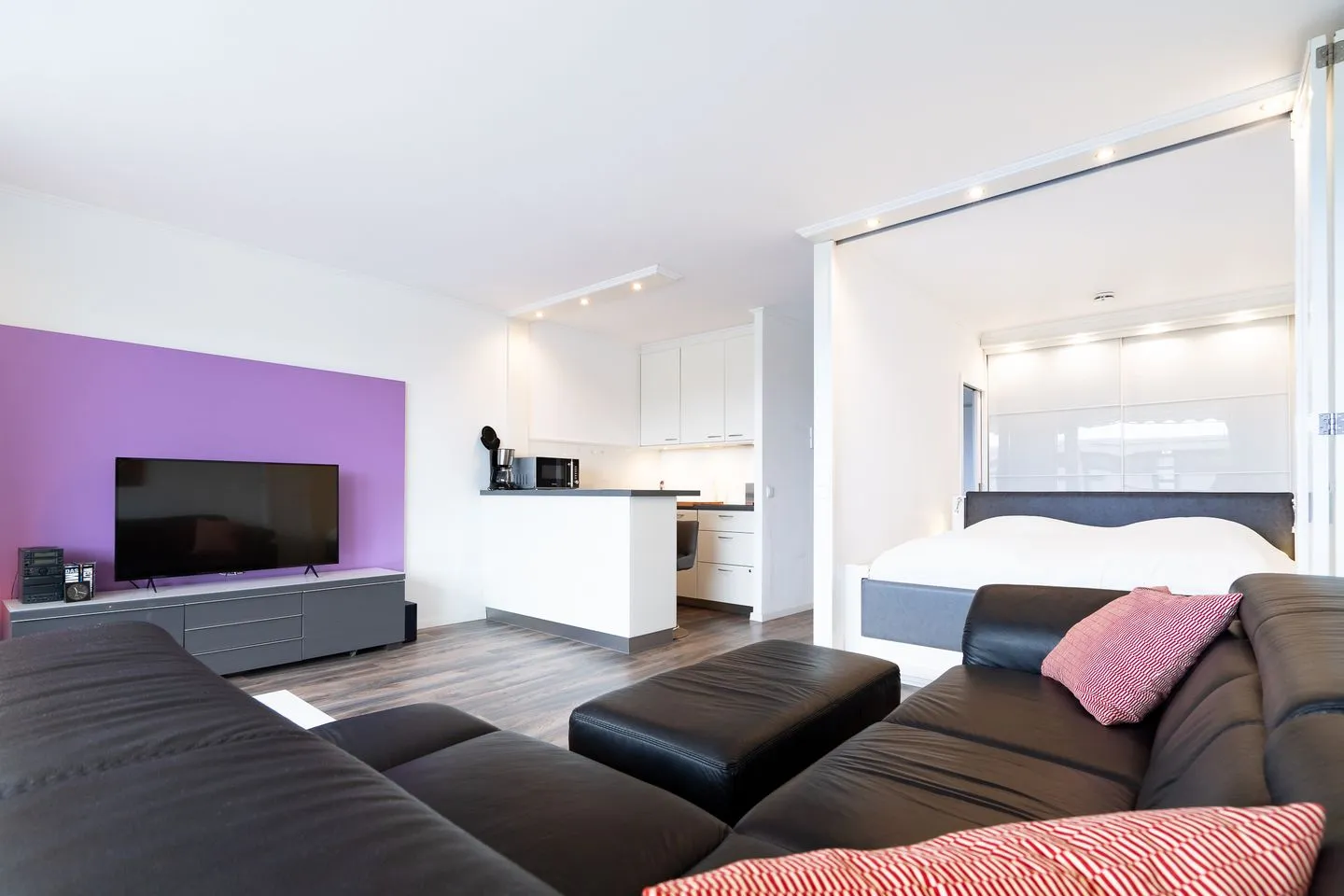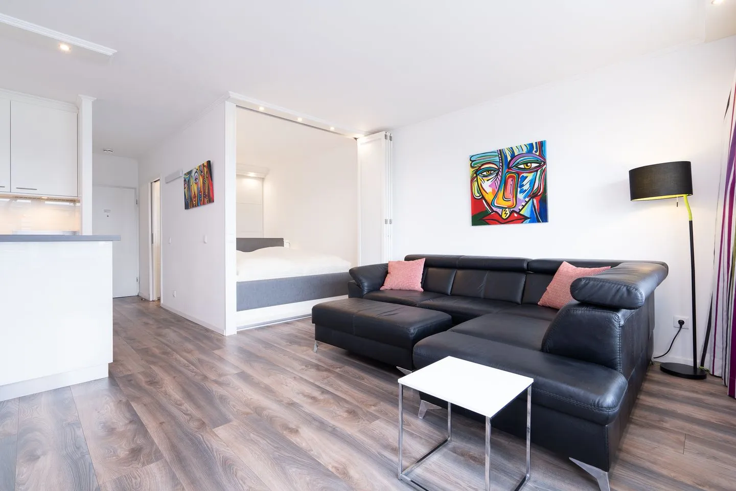Das moderne und attraktive Design der Wohnung wird durch ein Lichtkonzept mit zahlreichen Lichtquellen abgerundet. PKW-Stellplatz inklusive. Die Ferienwohnung liegt in einem 8-stöckigen Gebäude im Hochparterre (Balkon ca. drei Meter hoch, wie erstes OG).