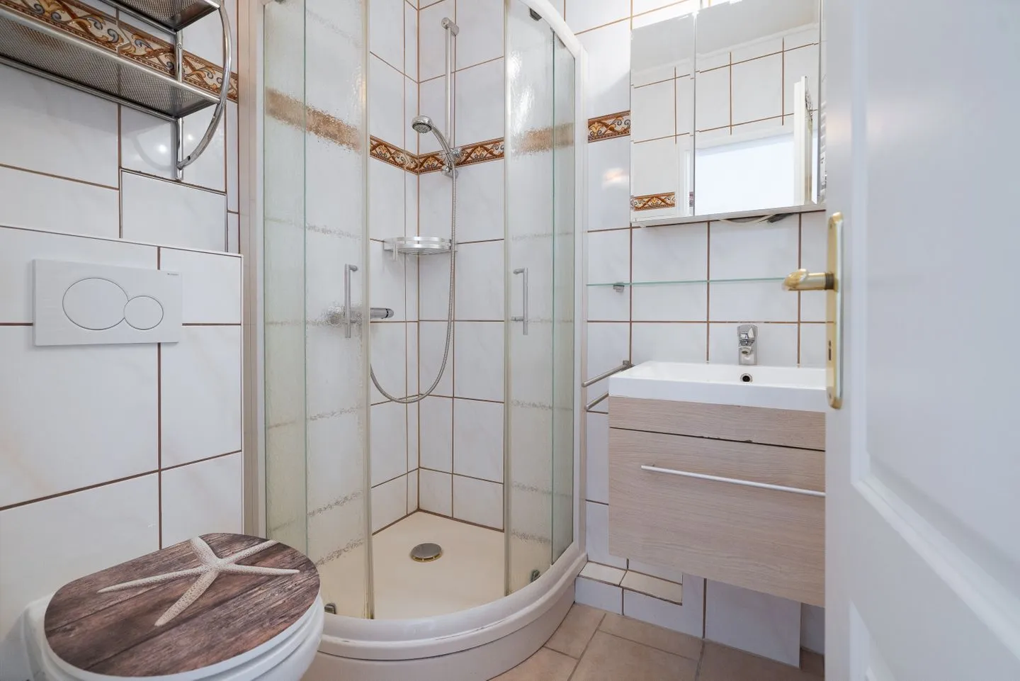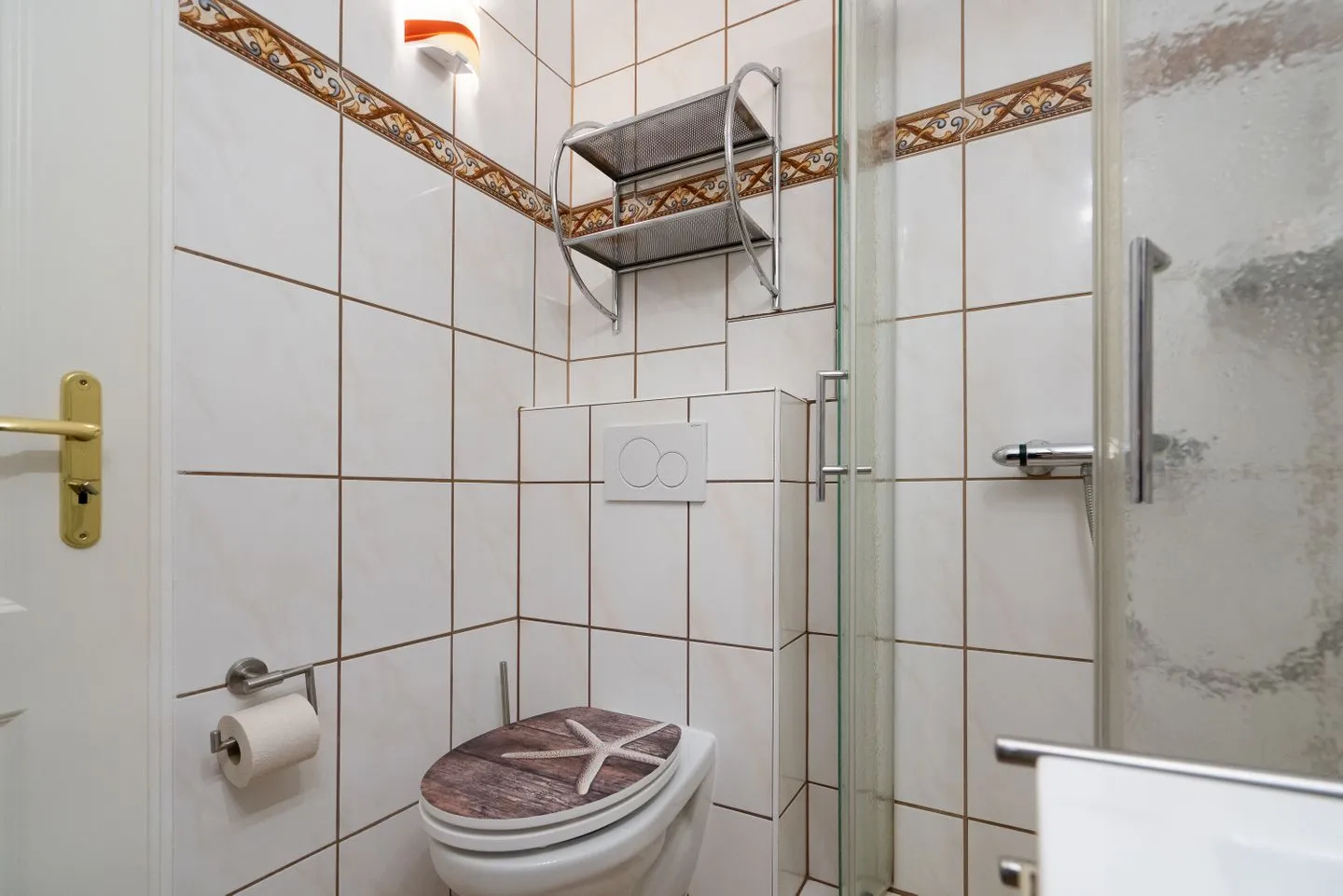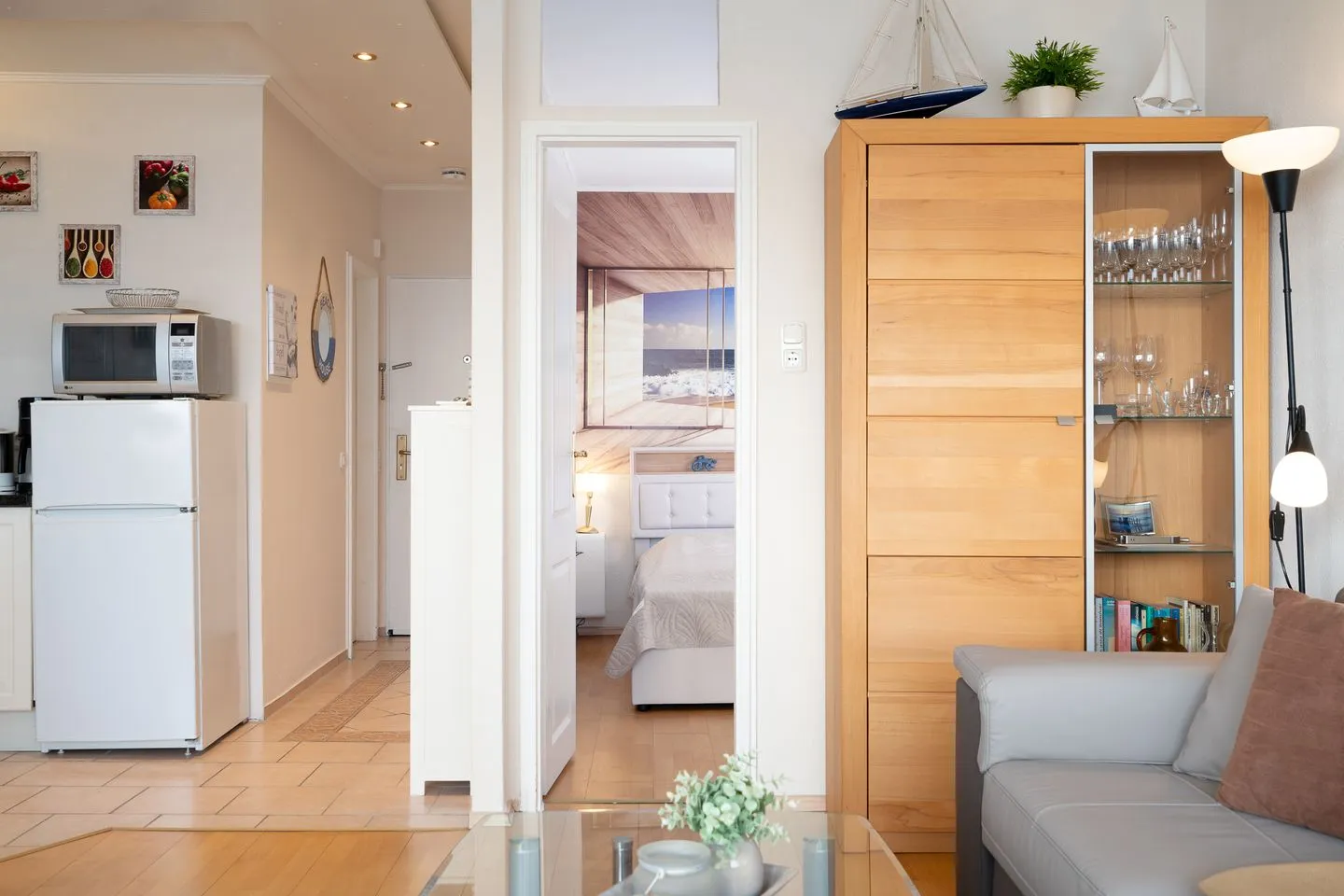 Der helle Buche-Parkettfußboden erzeugt eine Wohlfühlatmosphäre. Ein modernes Boxspringbett (160 cm x 200 cm), mit je zwei übereinander liegenden, getrennten Matratzen und ein großer Eckschrank erwarten Sie im Schlafzimmer. Die Wohnlandschaft (125 x 200 cm) im Wohnbereich wird mit wenigen Handgriffen in ein weiteres Bett verwandelt. Das helle Duschbad ist innenliegend.