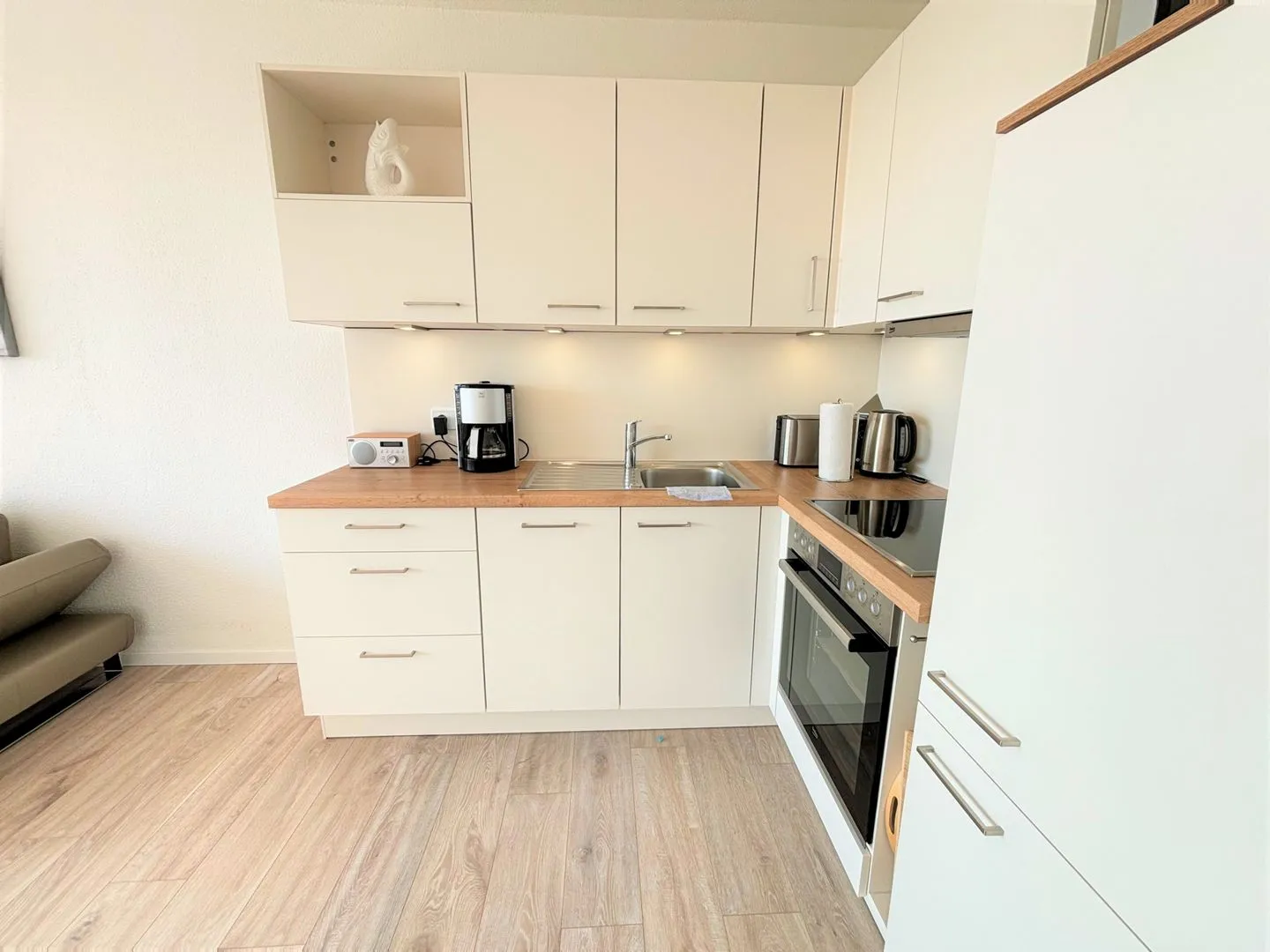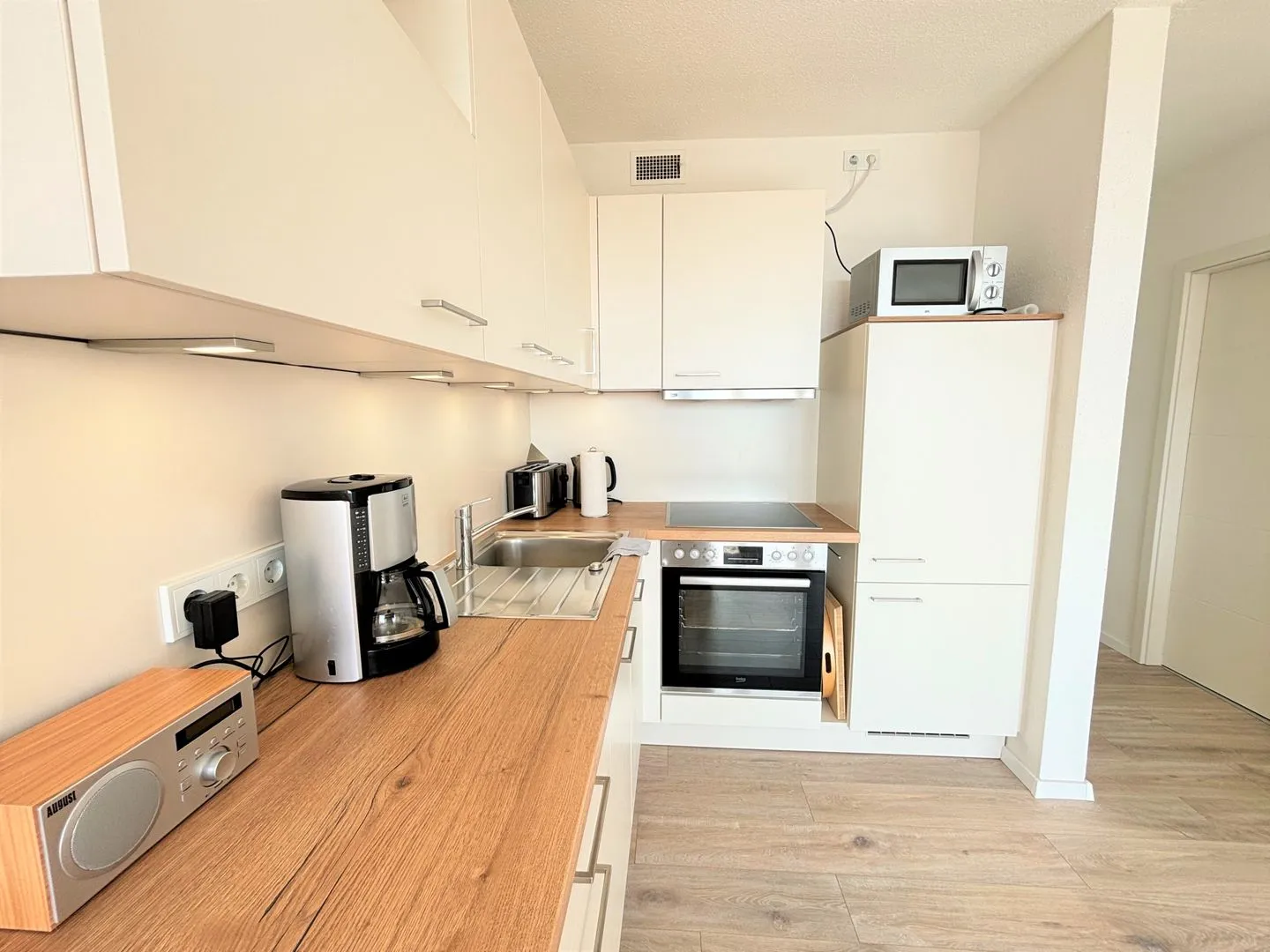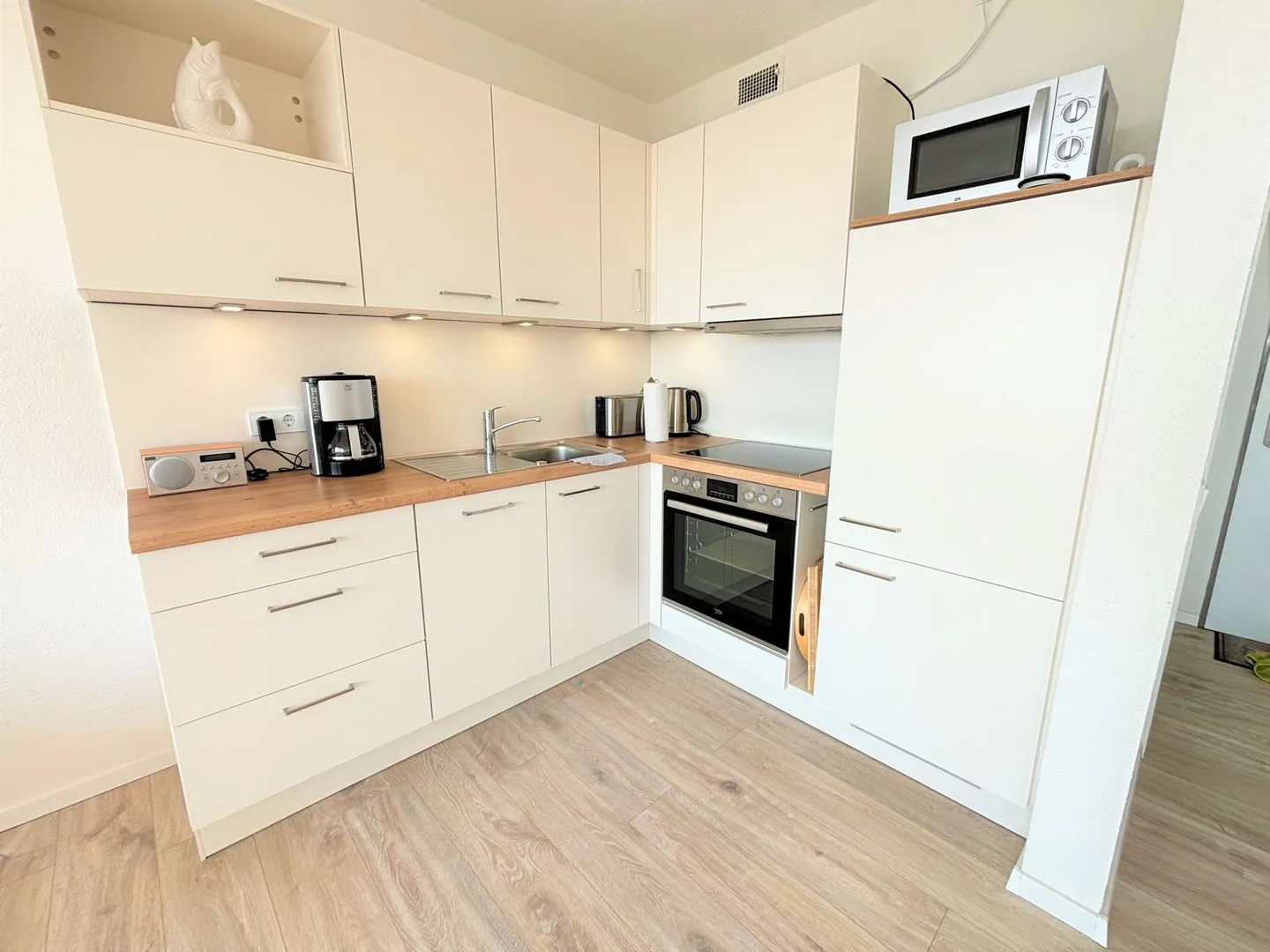 In diesem schönen Feriendomizil kommen Sie und Ihre Familie ganz schnell in Urlaubsstimmung! Vom Balkon haben Sie über die Anlange hinweg Ostseeblick „bis zum Horizont“. Im gemütlich und farblich abgestimmten Wohn- und Essbereich mit offener Küche steht ein komfortables Schrankbett (Doppelbett 160 x 200 cm). Die moderne Küche ist mit Spülmaschine, Backofen und Herd voll ausgestattet. Die dort zubereiteten Mahlzeiten können Sie ganz bequem am Esstisch einnehmen und den Abend im Anschluss gemütlich auf dem Sofa oder auf dem Balkon ausklingen lassen. Für die Kinder steht im separaten Schlafzimmer ein Etagenbett (90 x 190 cm) und ein TV-Gerät zur Verfügung. Das neue und helle Duschbad ist innenliegend. Ohne eine Straße überqueren zu müssen, sind es zum flach abfallenden Sandstrand nur wenige Fußschritte. PKW-Stellplatz inklusive.