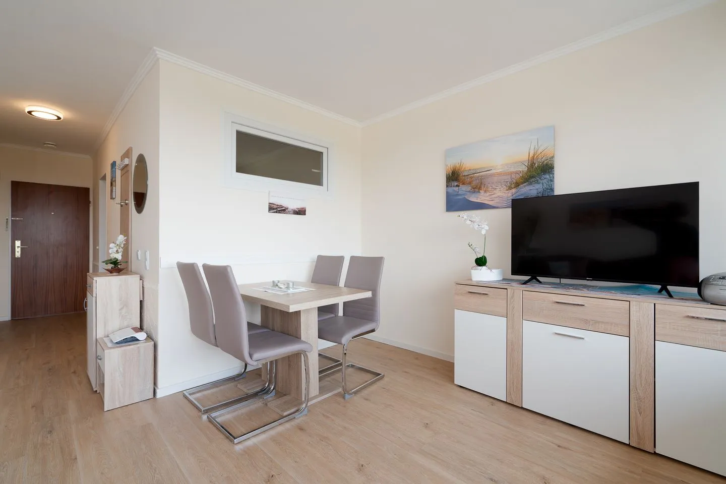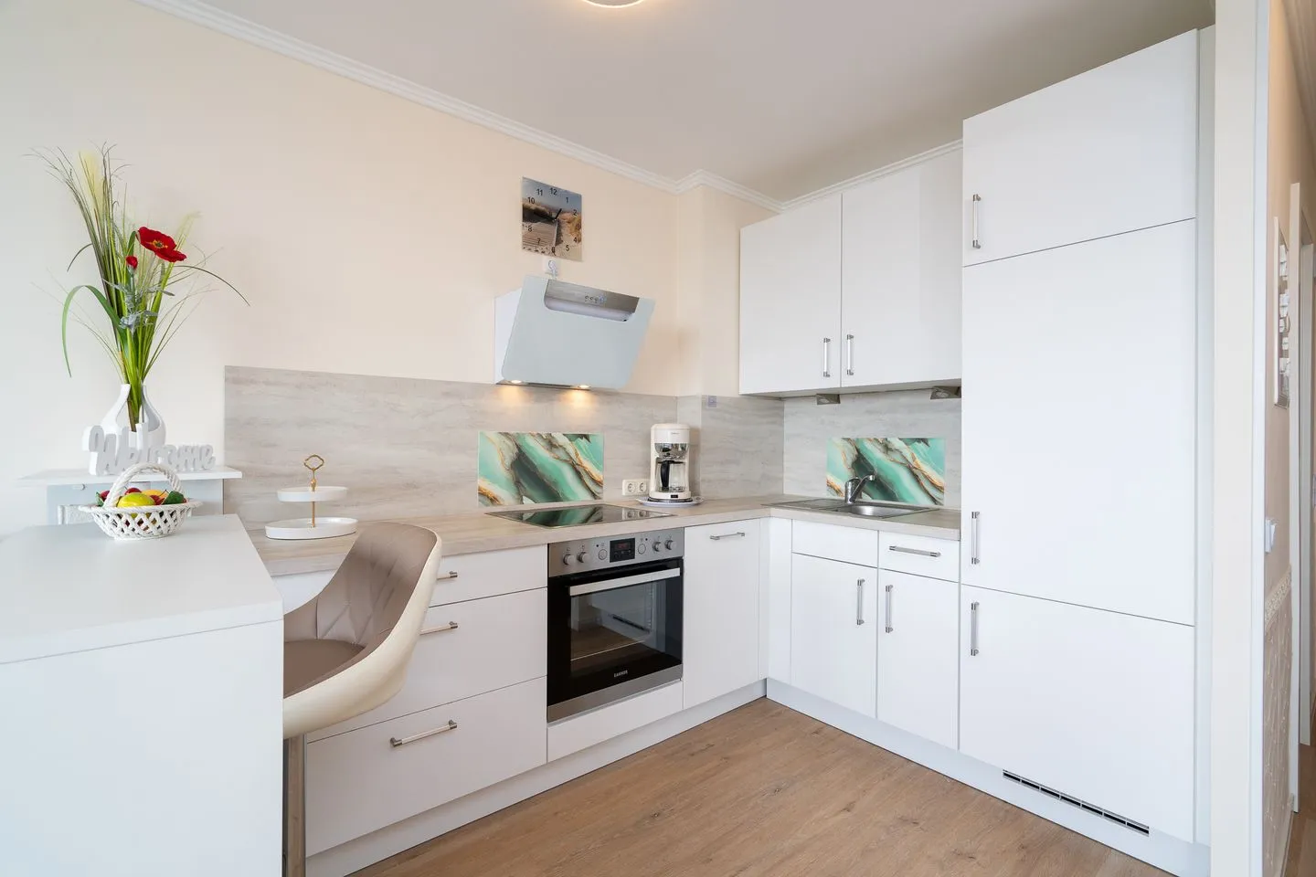 Es erwartet Sie eine moderne und gemütliche 2-Raum-Ferienwohnung in der 9. Etage der Apartmentanlage Ferienpark. Der möblierte Süd-West-Balkon hat seitlichen Ostseeblick in die Lübecker Bucht. Die Wohnung ist ca. 42 qm groß und für bis zu 3 Personen ausgestattet. Die Küche ist in den Wohnraum integriert und mit Spülmaschine, Backofen und Herd ausgestattet. Der innenliegende Schlafbereich bietet ein Doppelbett (2x 80 cm x 200cm), die Couch (160 x 200 cm) im Wohnzimmer hat eine Schlaffunktion. Das moderne und helle Duschbad ist innenliegend. Der Strand ist mit wenigen Fußschritten erreichbar. PKW-Stellplatz inklusive.