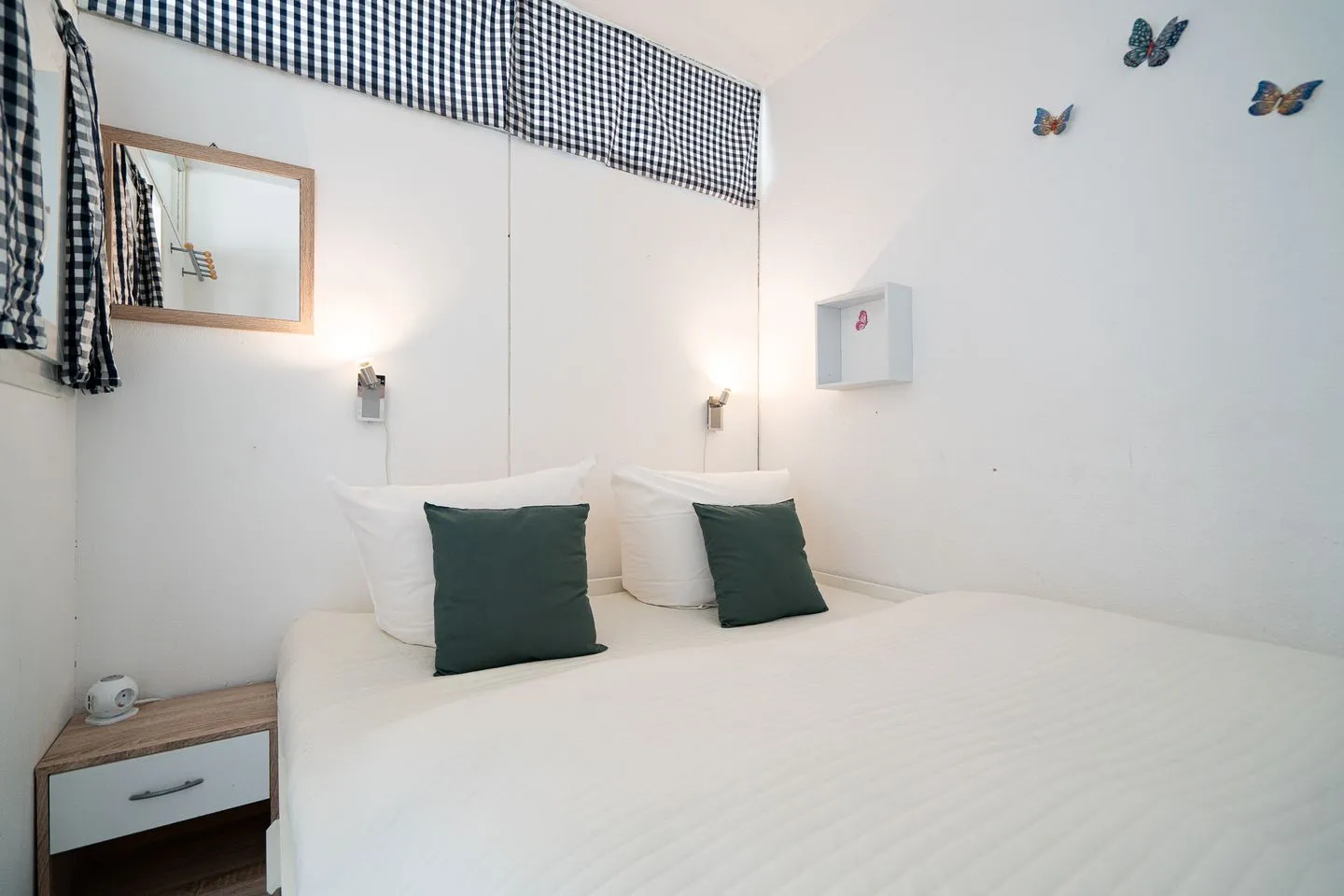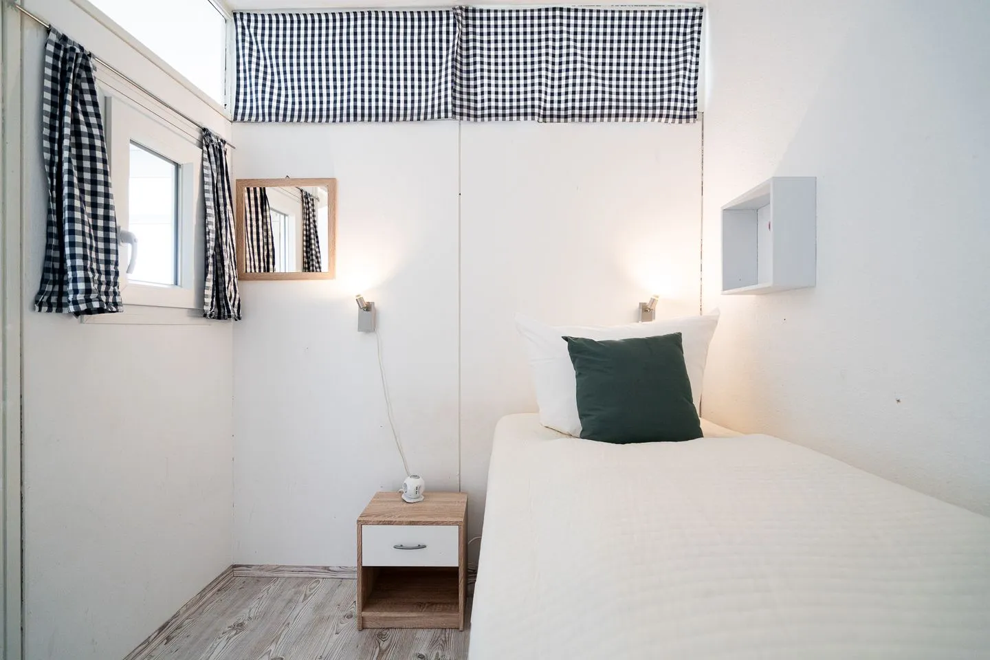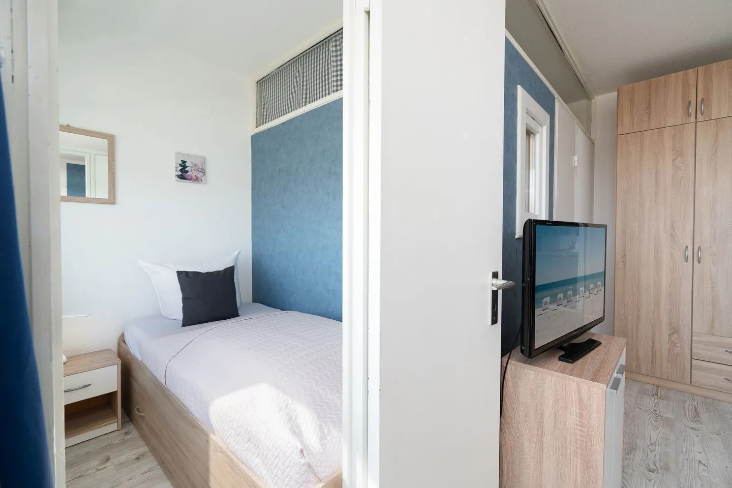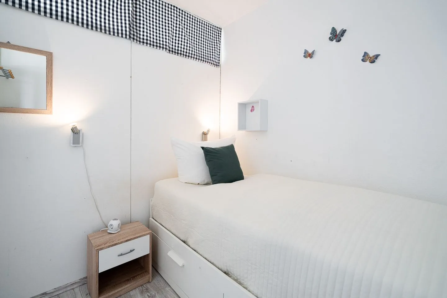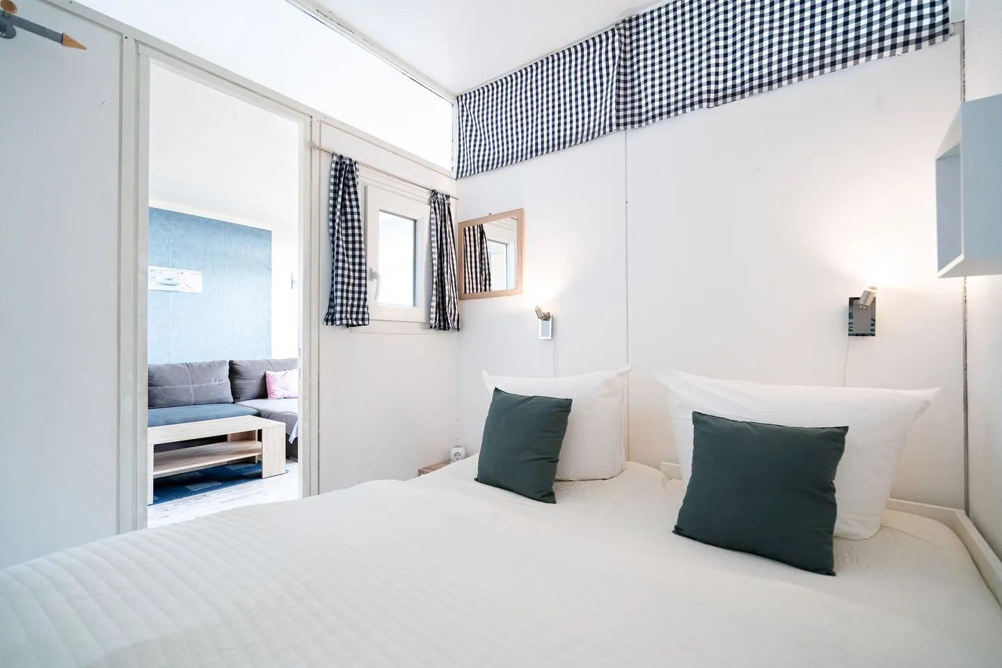 Die Ferienwohnung verfügt über zwei separate Schlafzimmer sowie ein Wohnzimmer mit Sofaecke und Essbereich. Das durchdachte Raumkonzept sorgt für einen angenehmen Aufenthalt auch auf kompakter Wohnfläche. Die beiden Schlafzimmer bieten eine angenehme Rückzugsmöglichkeit: Schlafzimmer 1 ist mit einem Einzelbett ausgestattet (1 x EZB 90 x 200 cm, Verdunklung durch Gardinen) und liegt mit Blick auf den Balkon. Schlafzimmer 2 ist innenliegend, verfügt über ein Kojenbett, welches zu einem Doppelbett (1 x DB 2 x 80 x 200 cm, Verdunklung durch Gardinen) ausgezogen oder als Einzelbett genutzt werden kann.