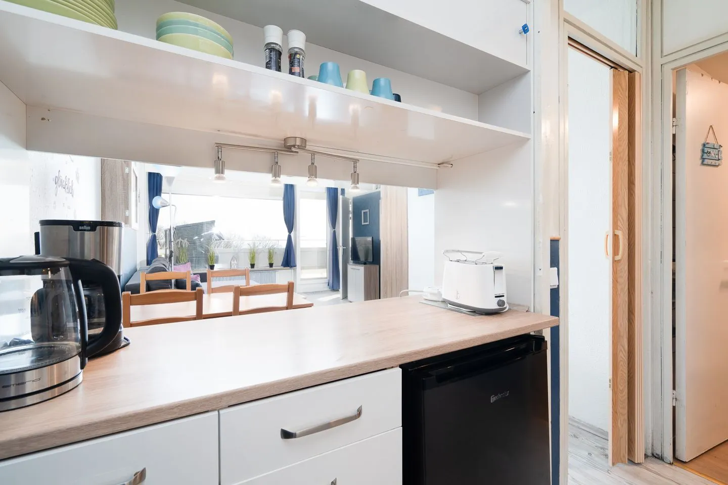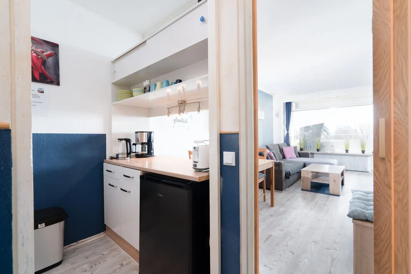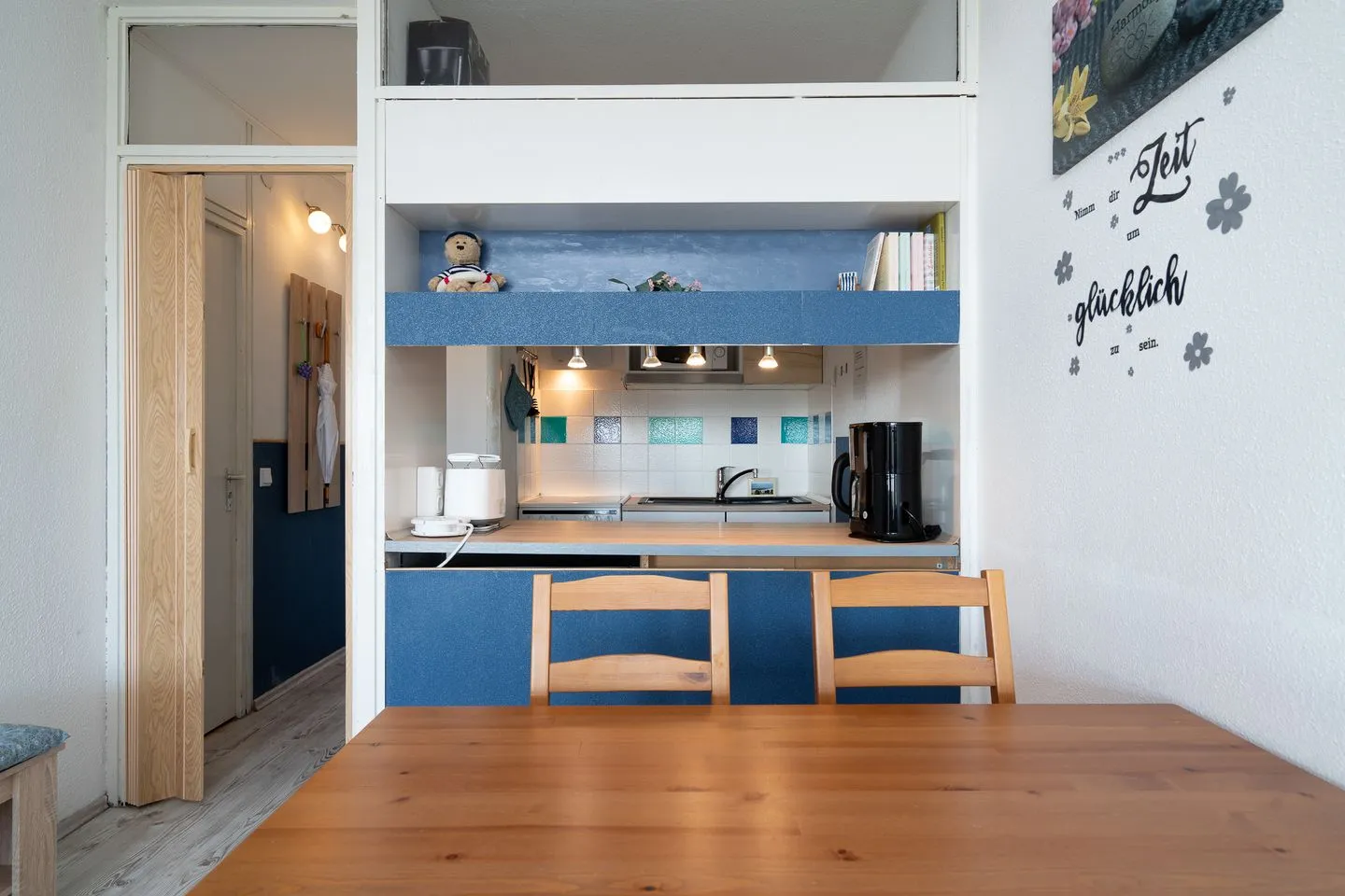 Die offene Küche ist harmonisch in den Wohnbereich integriert und ermöglicht eine flexible Selbstversorgung während Ihres Urlaubs. Sie ist mit einem Ceran-Herd, einem Elektro-Backofen, einer Mikrowelle sowie einem Kühlschrank mit Gefrierfach ausgestattet. Eine Kaffeemaschine ergänzt das Angebot für einen angenehmen Start in den Tag. Praktische Ausstattungsdetails wie ein Wäscheständer und ein Staubsauger stehen ebenfalls zur Verfügung.