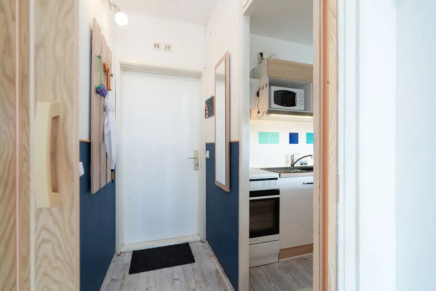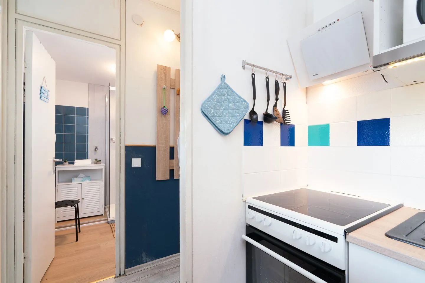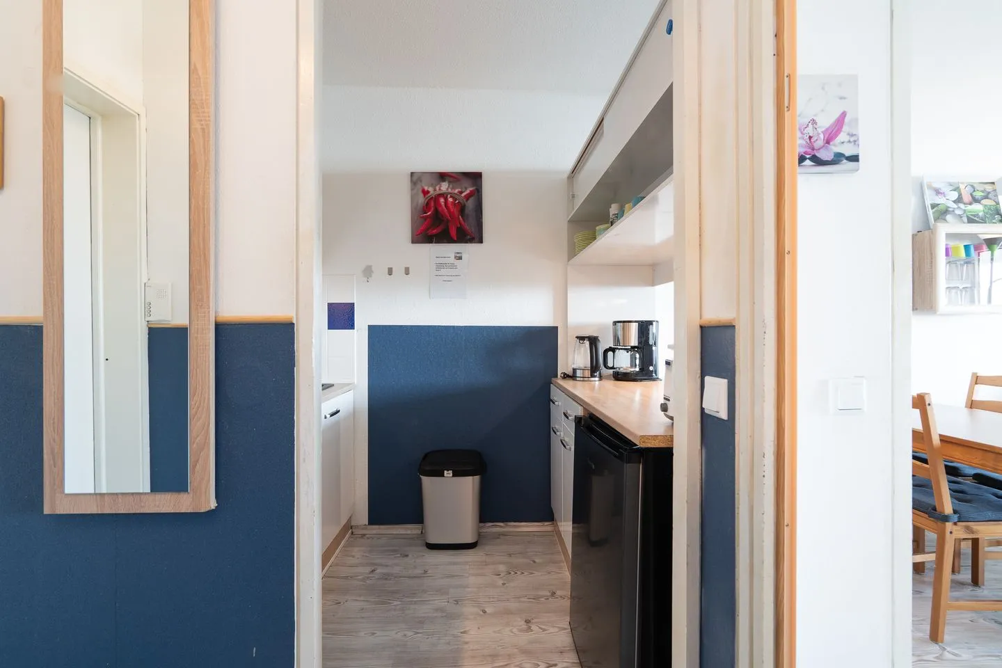 Die offene Küche ist harmonisch in den Wohnbereich integriert und ermöglicht eine flexible Selbstversorgung während Ihres Urlaubs. Sie ist mit einem Ceran-Herd, einem Elektro-Backofen, einer Mikrowelle sowie einem Kühlschrank mit Gefrierfach ausgestattet. Eine Kaffeemaschine ergänzt das Angebot für einen angenehmen Start in den Tag. Praktische Ausstattungsdetails wie ein Wäscheständer und ein Staubsauger stehen ebenfalls zur Verfügung.