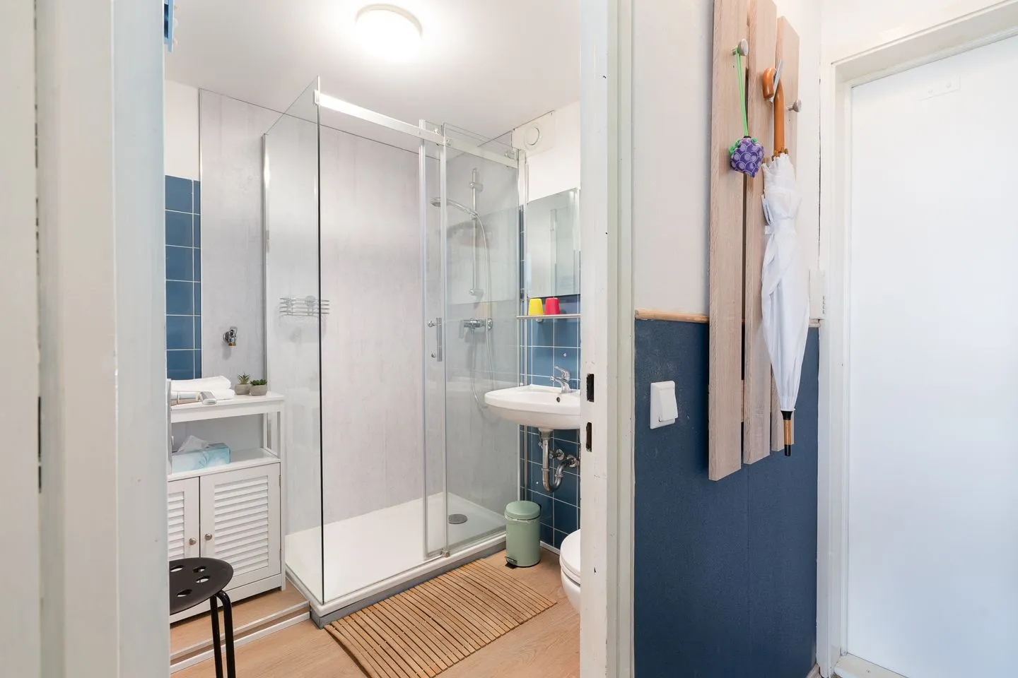 Das Badezimmer ist funktional gestaltet und mit einer Dusche mit niedrigem Einstieg ausgestattet. Ein Haartrockner ist vorhanden und sorgt für zusätzlichen Komfort während Ihres Aufenthalts.