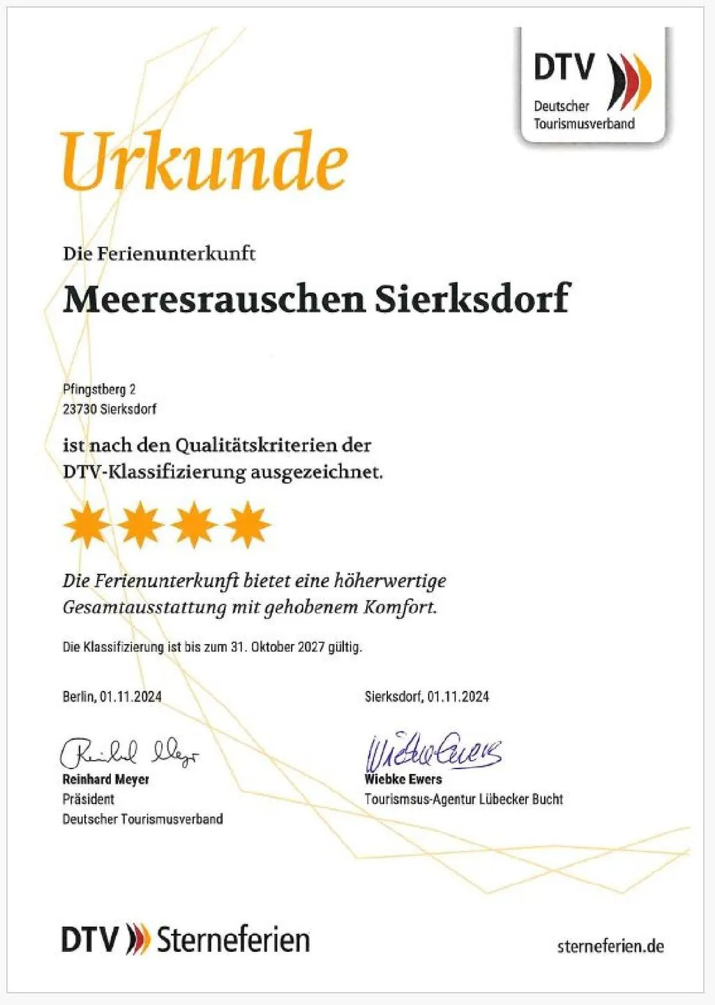 Die Wohnung ist offiziell vom Deutschen Tourismusverband (DTV) mit **** klassifiziert.