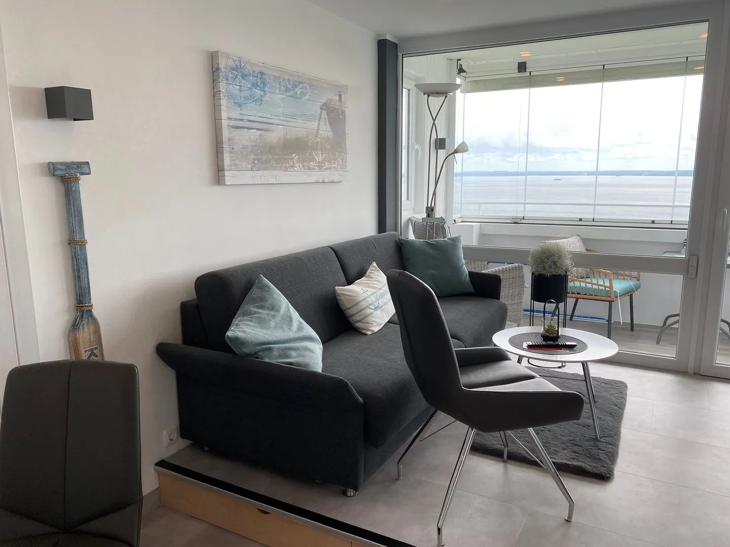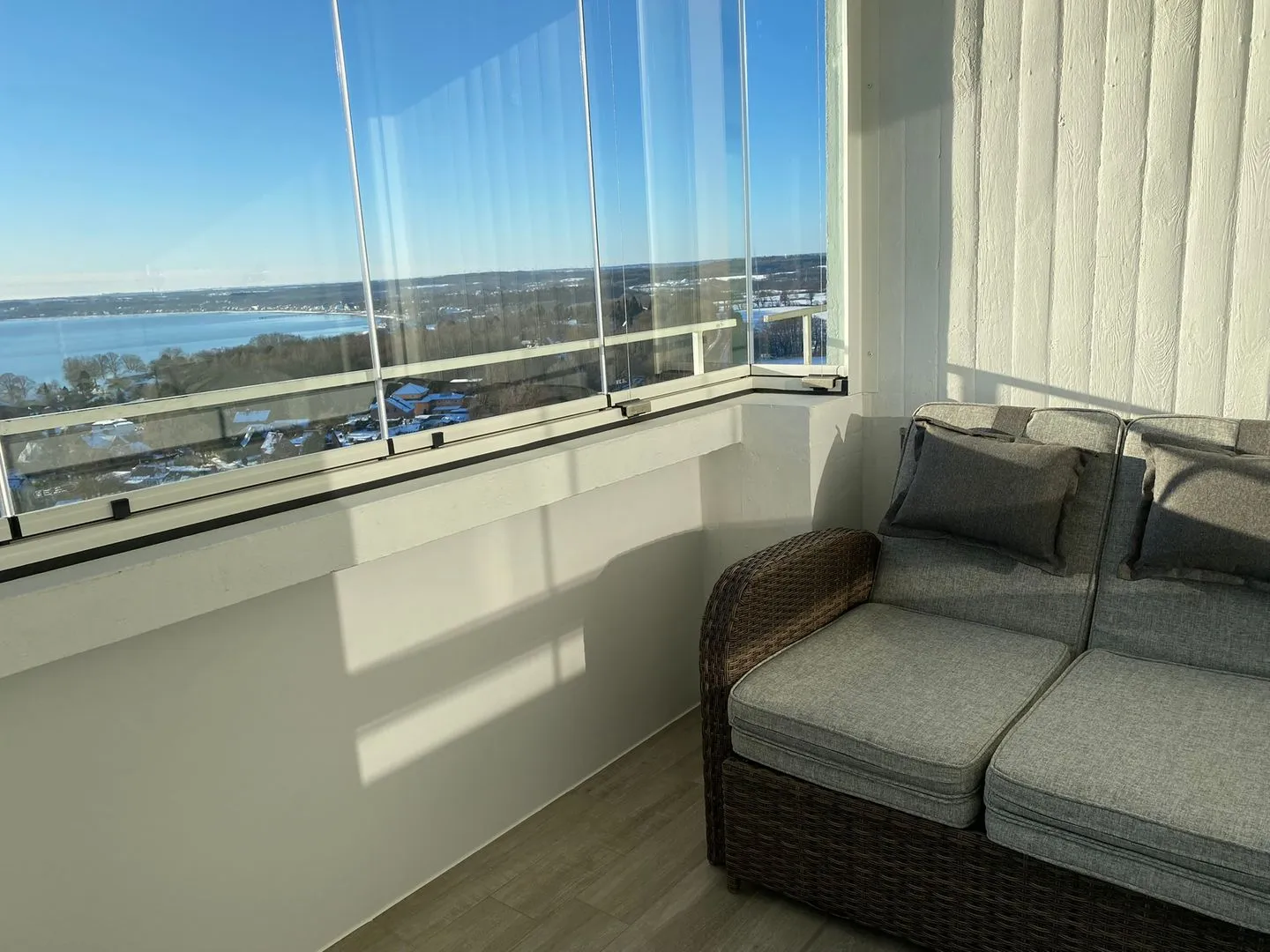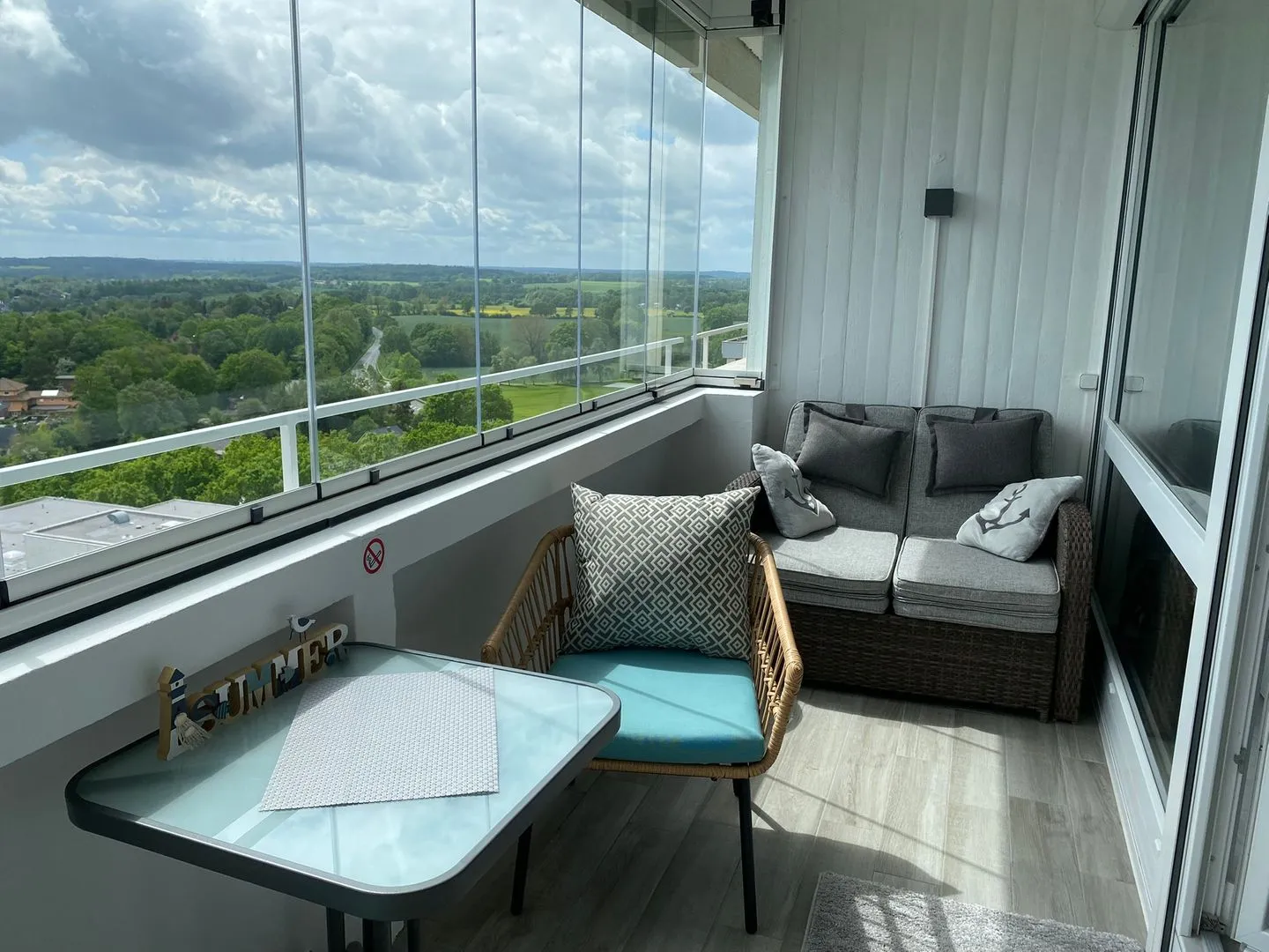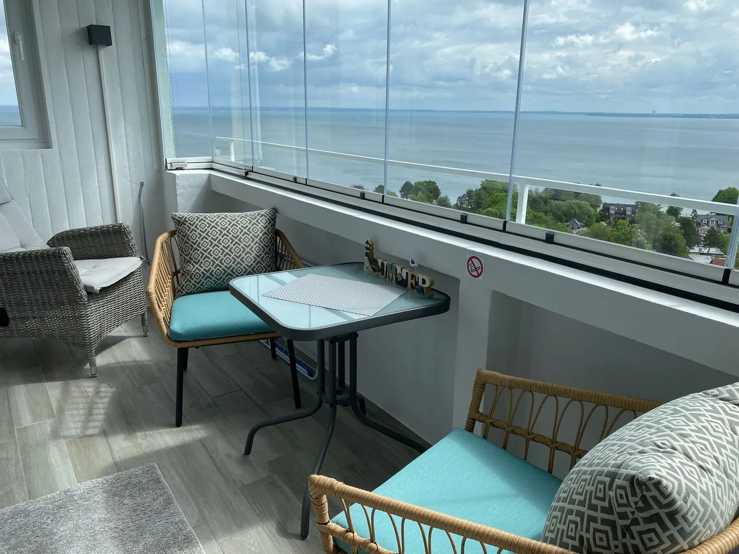 - verglaster Balkon mit ausklappbarer 2er-Lounge. Hochlehner und Frühstückstisch mit 2 Stühlen