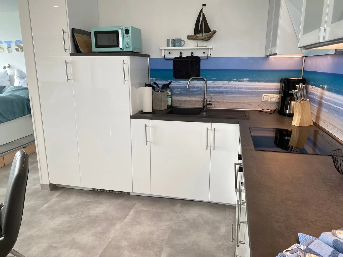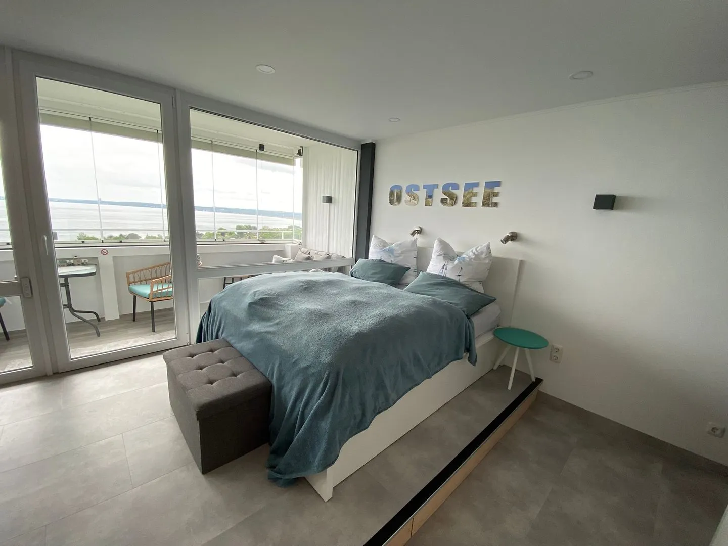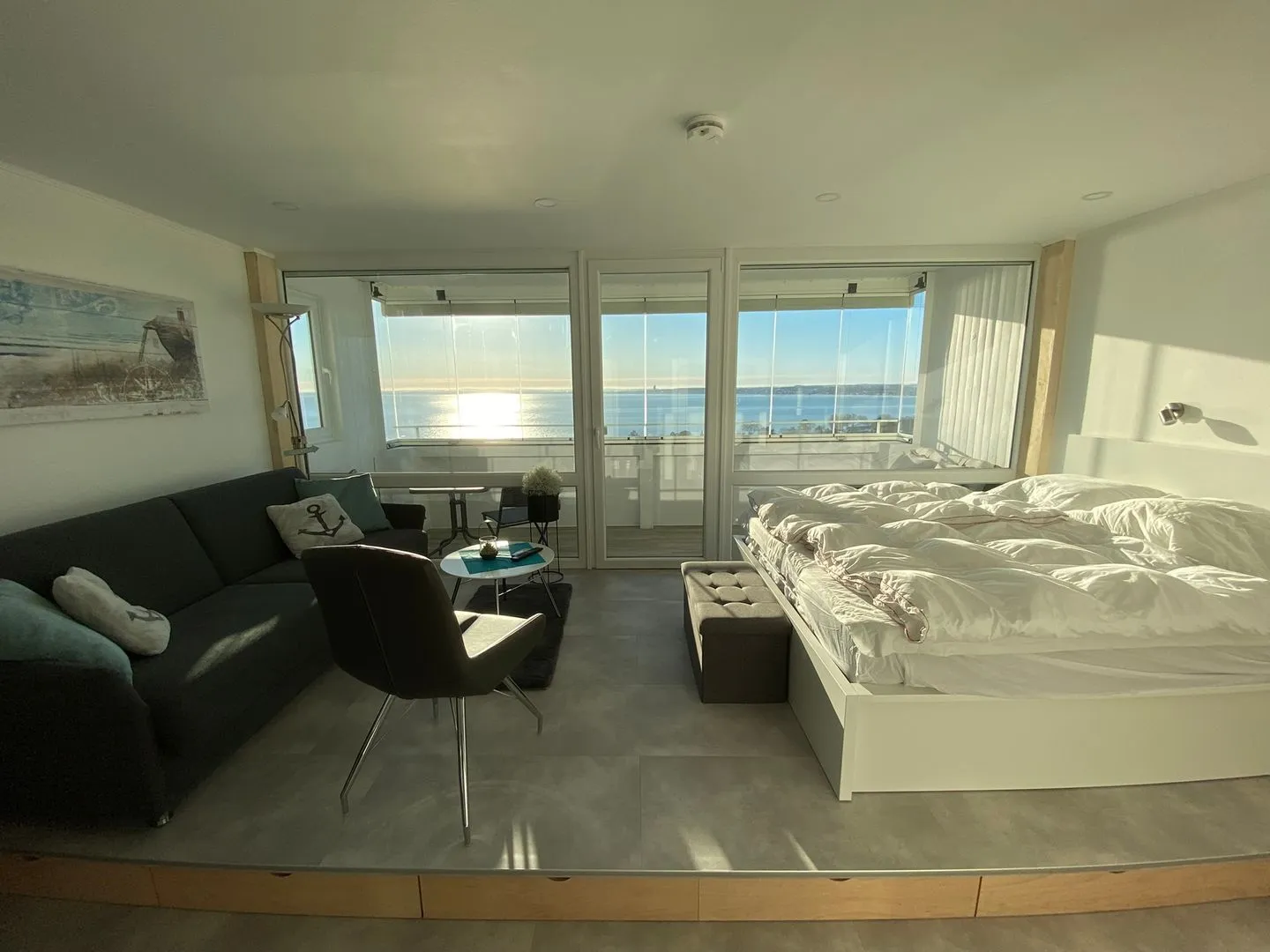 - im Wohn-/Schlafbereich: Doppelbett (2 hochwertige, 80cm Matratzen) direkt am Fenster mit Meerblick. Genießen Sie den Sonnenaufgang vom Bett aus.