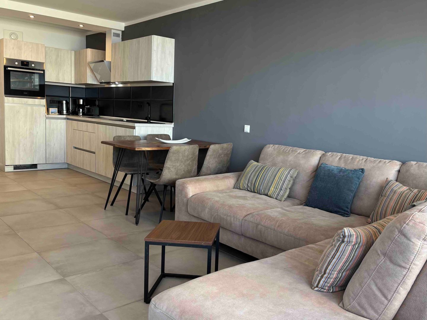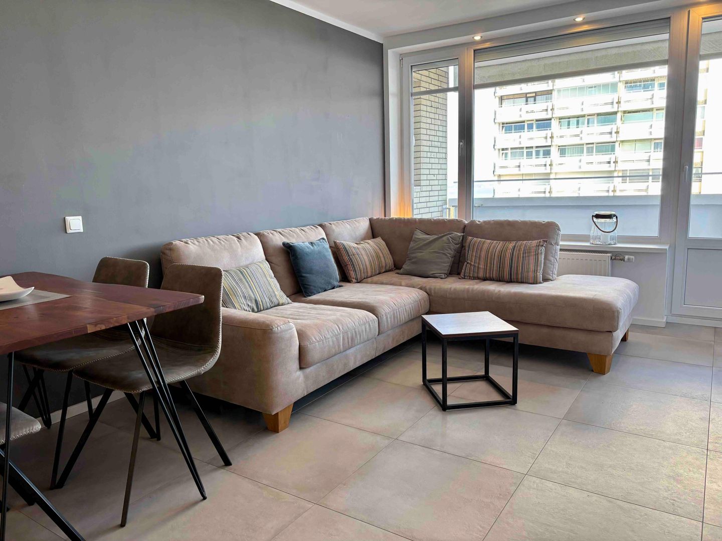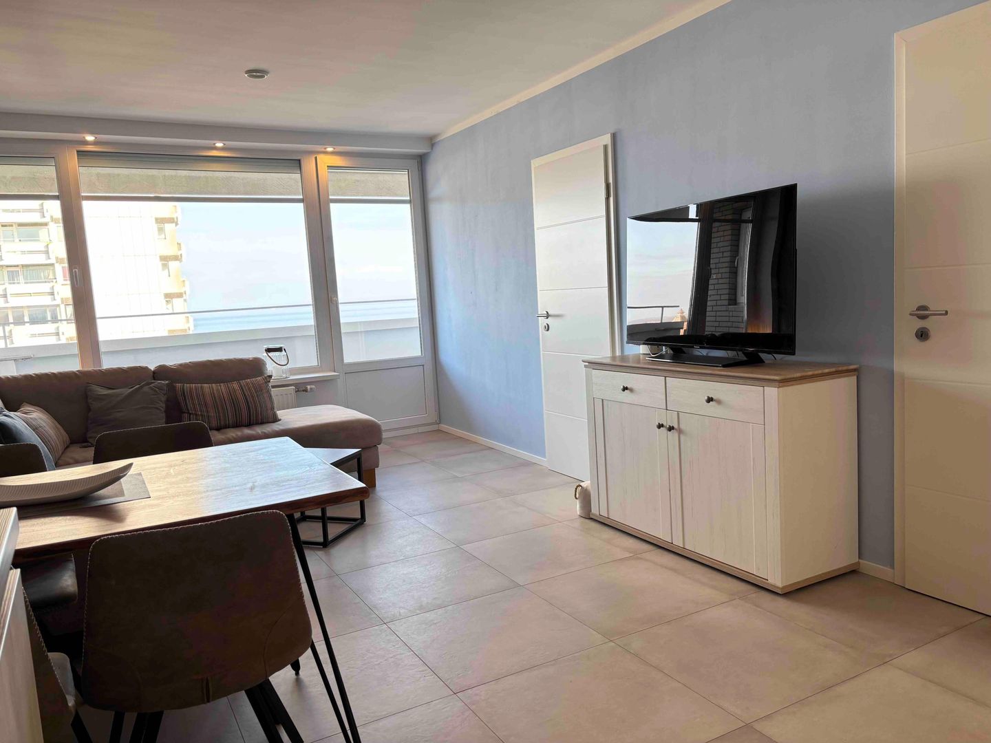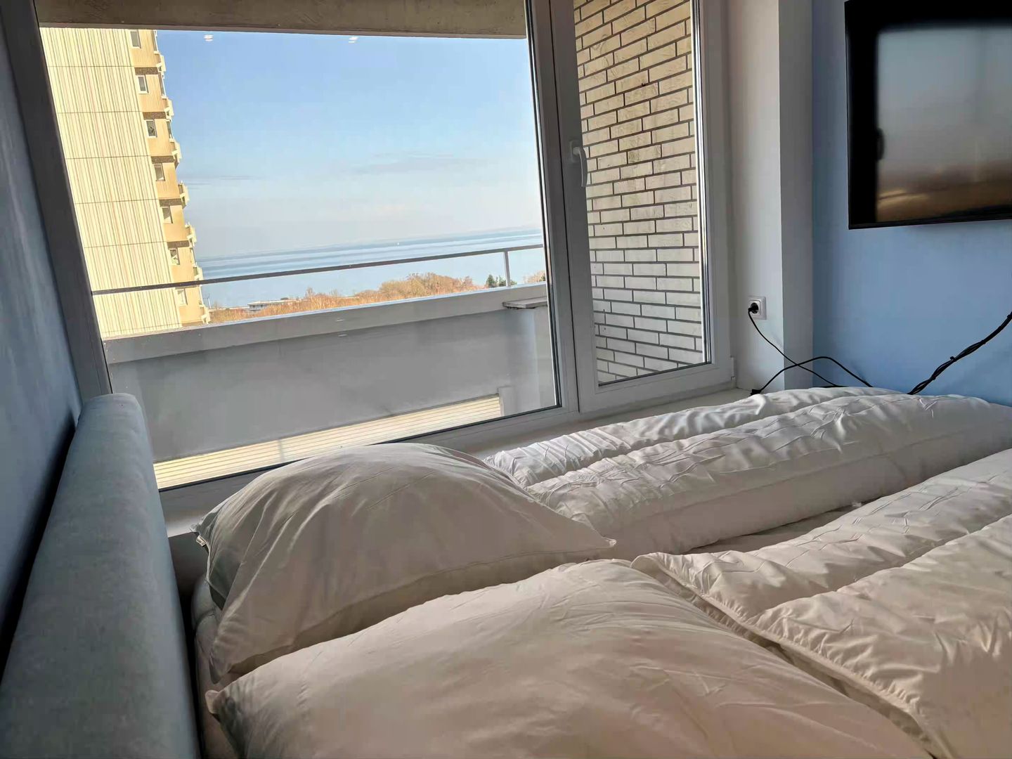 Der lichtdurchflutete Wohnbereich verfügt über eine gemütliche Sitzecke mit Smart-TV sowie Panoramablick über die Ostsee. Von hier aus gelangen Sie direkt auf den Balkon – perfekt für ein Frühstück mit Meeresrauschen oder einen entspannten Tagesausklang mit uneingeschränktem Meerblick.
