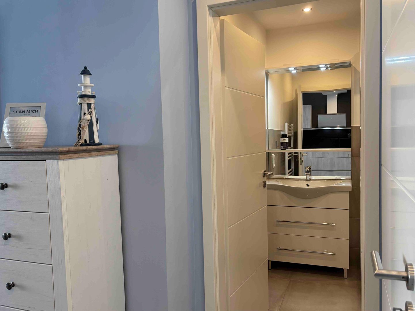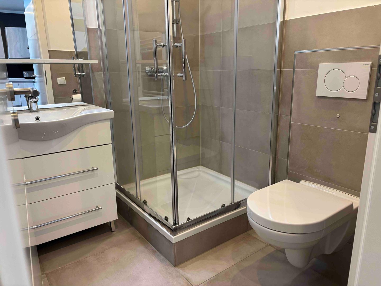 Das Badezimmer ist geschmackvoll in hellen Farbtönen gestaltet und mit Dusche, Waschtisch, Spiegel und WC ausgestattet. In einer separaten Abstellkammer steht ein Waschtrockner für die Urlaubswäsche zur Verfügung.