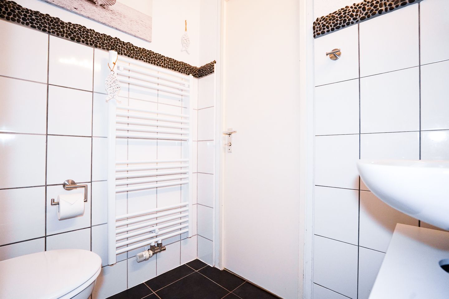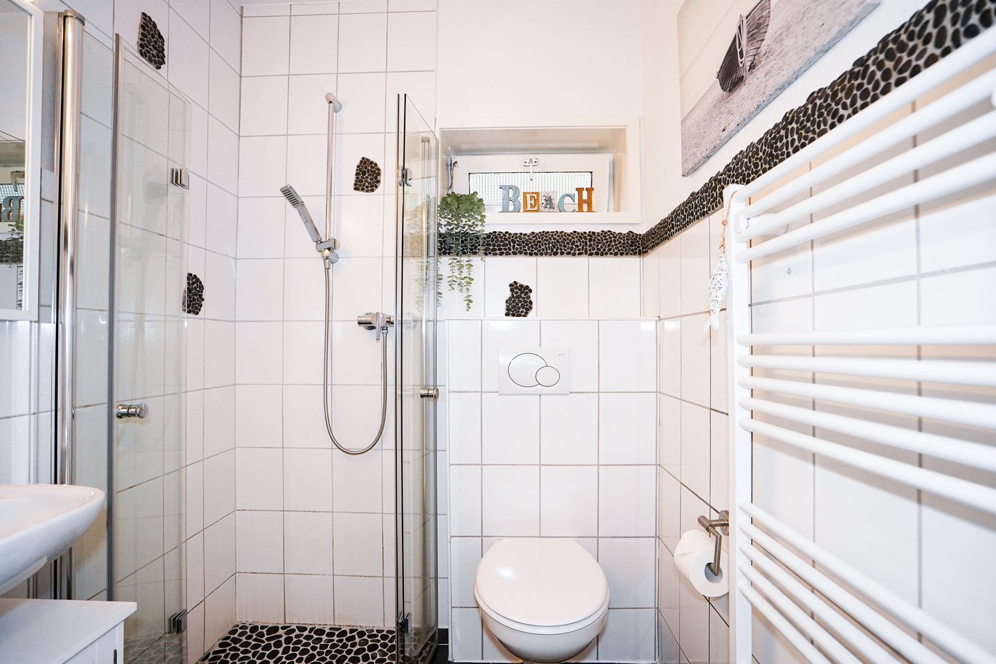 Das moderne Badezimmer verfügt über eine Dusche, einen Handtuchheizkörper und ein kleines Fenster. Für weiteren Komfort sorgen gemeinschaftlich nutzbare Waschmaschine und Trockner im Haus – besonders praktisch für längere Aufenthalte oder mitreisende Kinder.