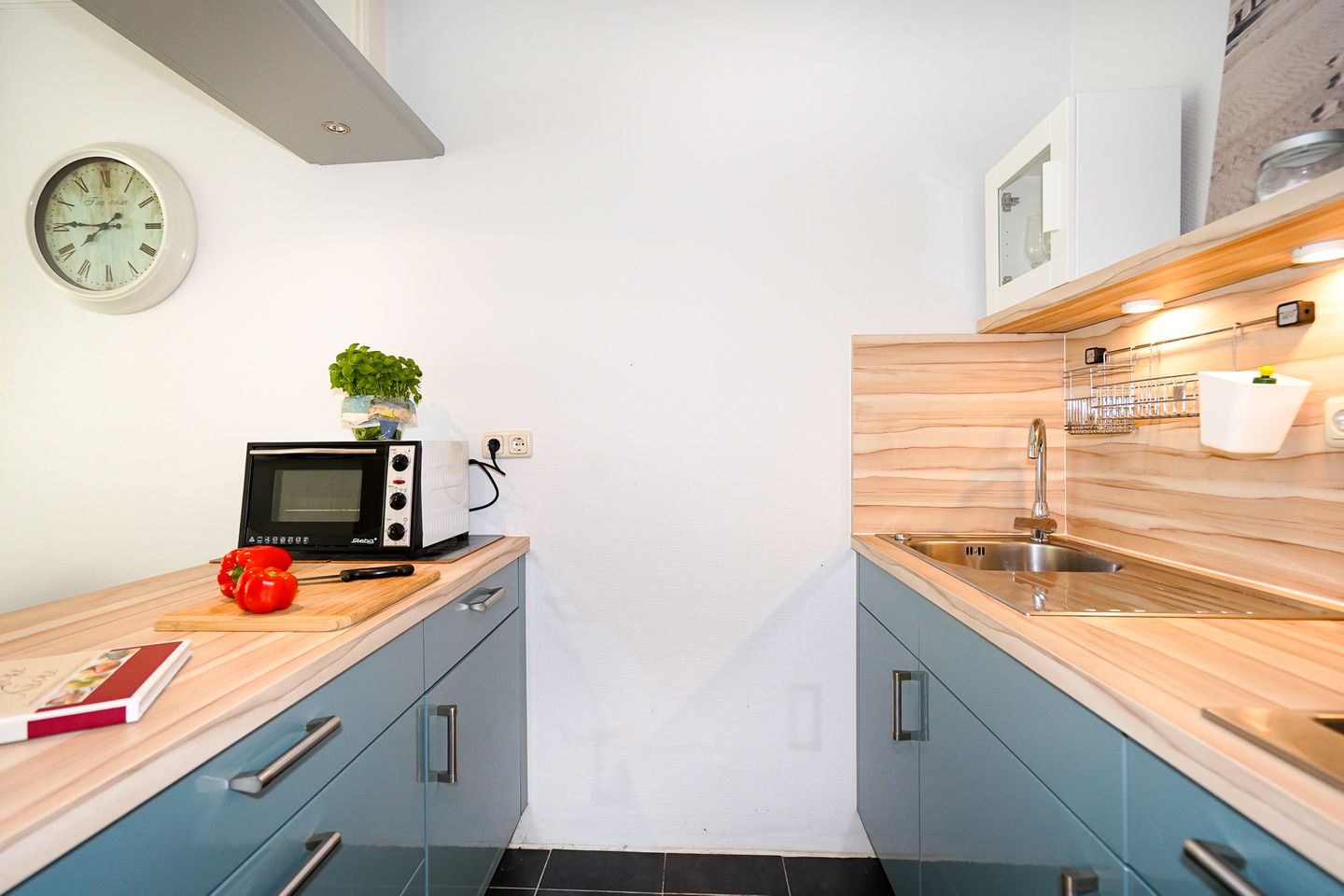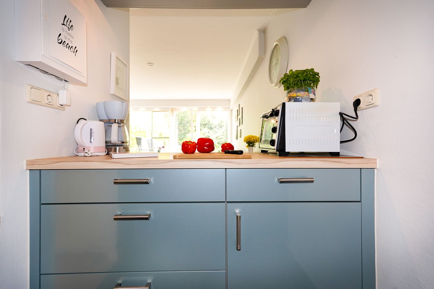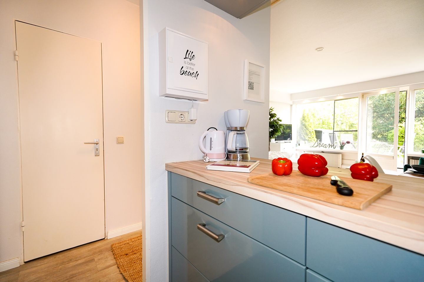 Die moderne, offene Küche grenzt direkt an den Wohnbereich und ist mit allem ausgestattet was man zur Selbstverpflegung benötigt wie Kühlschrank mit separatem Gefrierfach, Spülmaschine, Cerankochfeld, Backofen, Kaffeemaschine, Toaster und Wasserkocher. Ein Essbereich mit Esstisch lädt zu gemeinsamen Mahlzeiten ein.