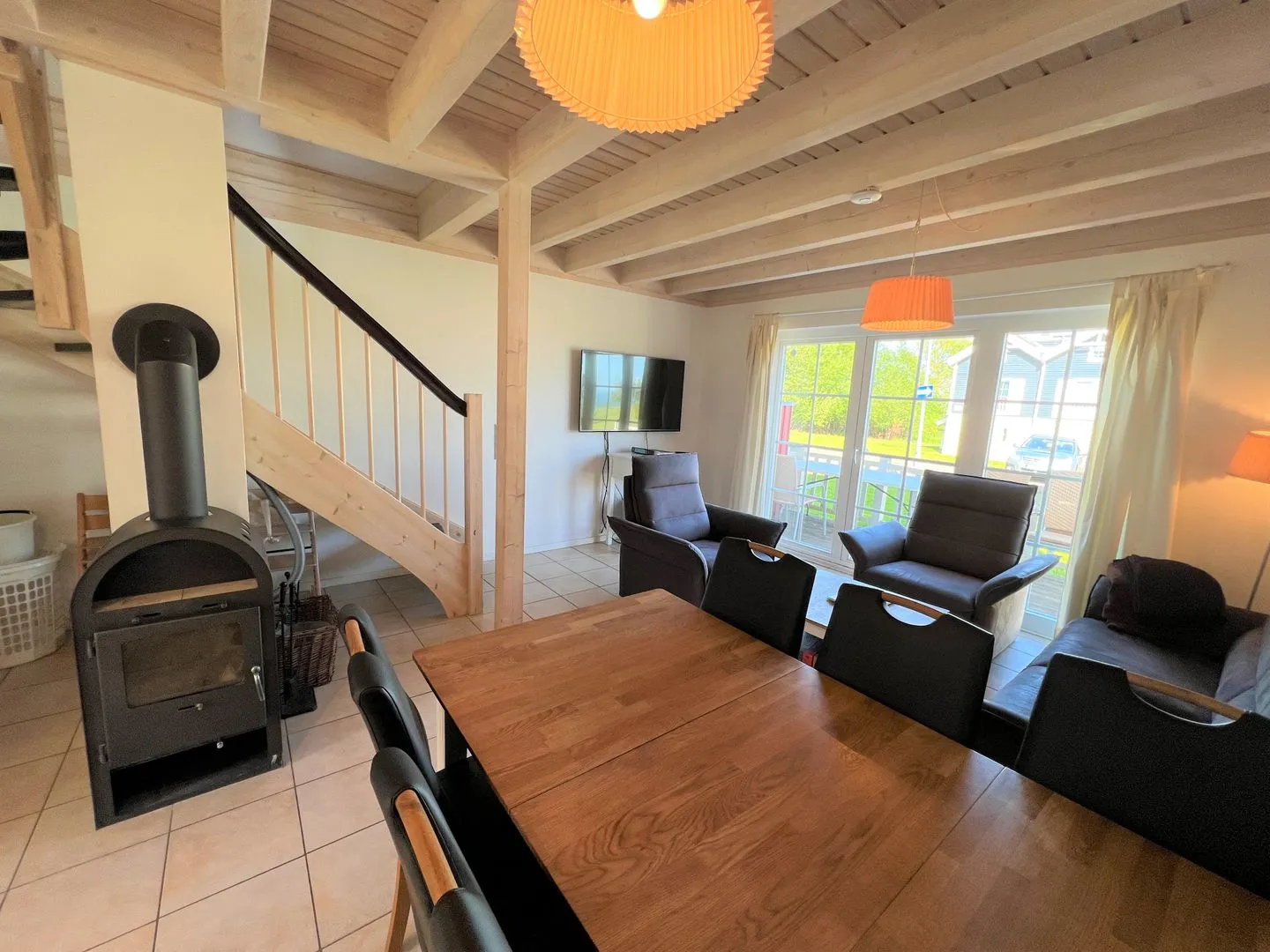 Die 84 qm großen Doppelhaushälften vom Typ "Windjammer" bieten viel Platz und Wohlfühl-Komfort über 3 Ebenen. Der Wohn- und Essbereich mit Kamin und offener Küche mit Waschmaschine und die Sauna mit Dusche und WC liegen im Erdgeschoss. Die Küche ist mit Spülmaschine, Backofen und Herd voll ausgestattet. Der Komfort einer eigenen Sauna wird sehr von unseren Wintergästen geschätzt. In der ersten Etage sind 2 Schlafräume mit Doppelbetten (jeweils 2x 80 cm x 200 cm), sowie das Bad mit Whirlwanne. Einen 3. Schlafbereich mit Fernsehecke und 2 getrennten Betten (90 cm x 200 cm und 80 cm x 200 cm) findet man in der 2.Etage in einer offenen Schlafgalerie unterm Dach.