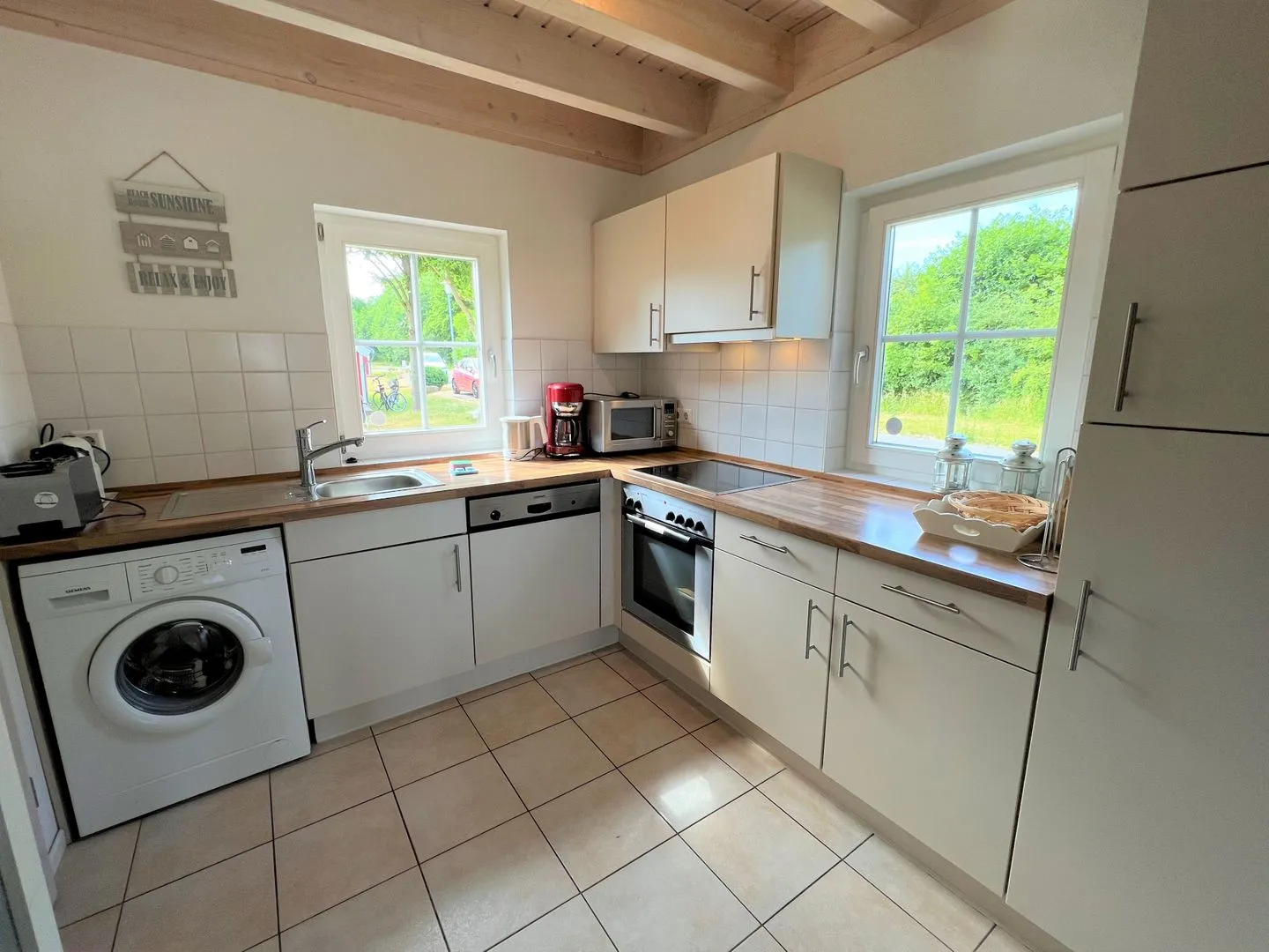 Alle Häuser sind Nichtraucherobjekte. Sie sind alle mit folgenden Annehmlichkeiten ausgestattet: moderne Einrichtung, Elektrofußbodenheizung, Kamin- bzw. Pelletofen, Zugang zur Holzterrasse (bitte nur auf dem Rasen grillen), Einbauküche mit Spülmaschine, Ceranfeld, großen Kühlschrank mit Gefrierfach, Waschmaschine, Kinderreisebettchen und PKW Stellplatz.