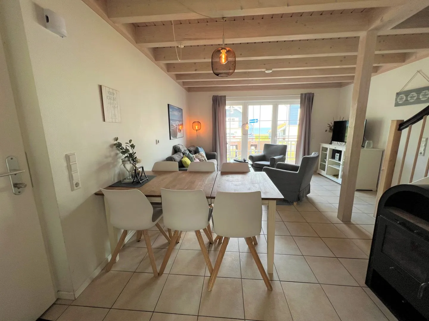 Der Wohn-Essbereich mit Kamin und der offene Küchenbereich mit Waschmaschine liegen im Erdgeschoss, sowie die Sauna mit Dusche und WC. Der Komfort einer eigenen Sauna wird sehr von unseren Wintergästen geschätzt. Vom Wohn- und Essbereich haben Sie Zugang zur Terrasse, von der Sie durch die anderen Häuser hindurch die Ostsee sehen können. In der ersten Etage sind 2 Schlafräume mit Doppelbetten, sowie das Bad mit Whirlwanne. Einen 3. Schlafbereich mit zwei getrennten Betten finden Sie in der 2.Etage in einer offenen Schlafgalerie unterm Dach. Für die kleinen Gäste stehen zahlreiche Spielsachen im Schuppen bereit, wie z.B. Roller (inkl. Helm), Strandspielzeug und Bollerwagen.