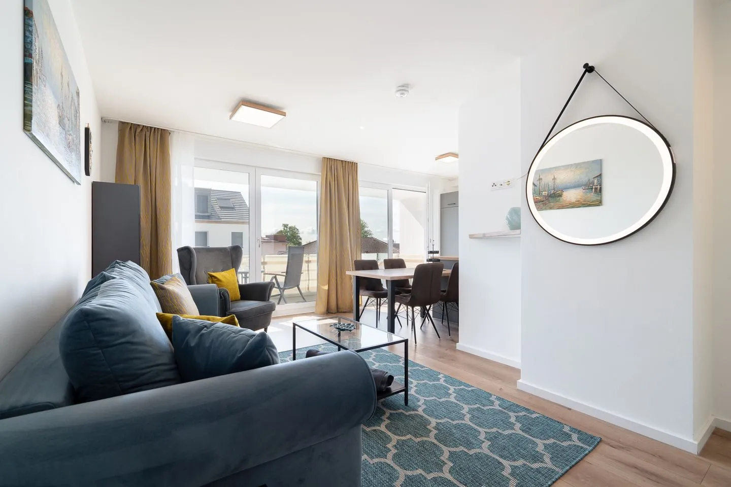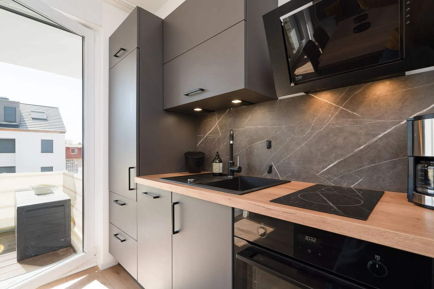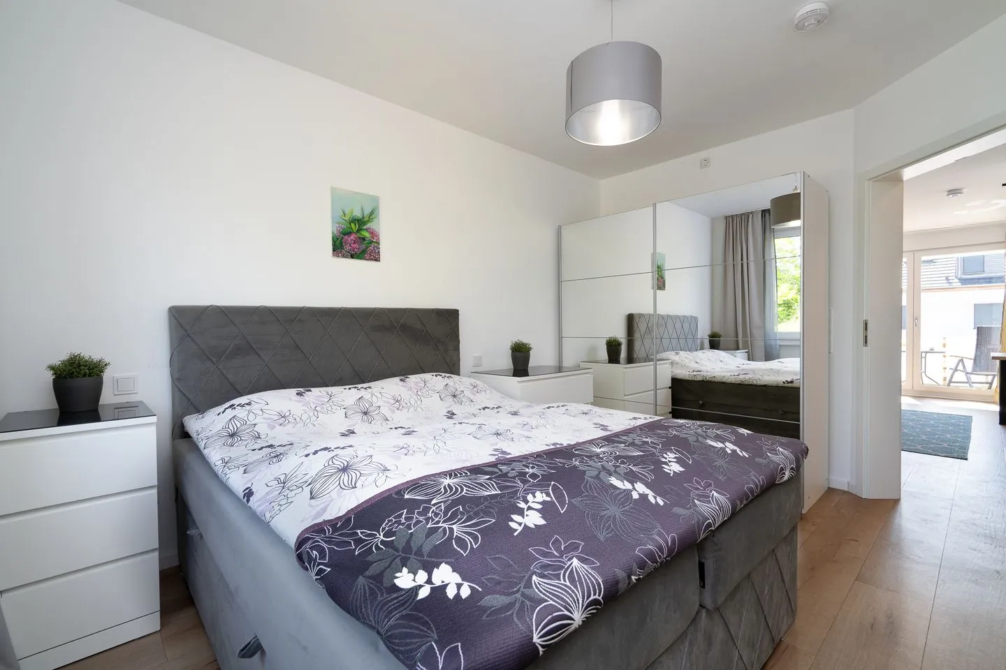 Der schöne Balkon, der mit Gartenmöbeln ausgestattet ist, rundet die gehobene und moderne Ausstattung der Wohnung ab. Die Sichtschutzvorrichtungen an den Fenstern garantieren zudem Ihre Privatsphäre.