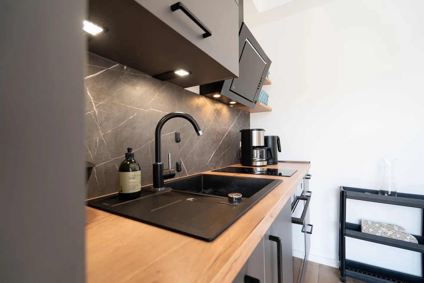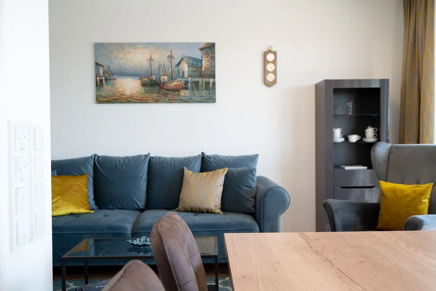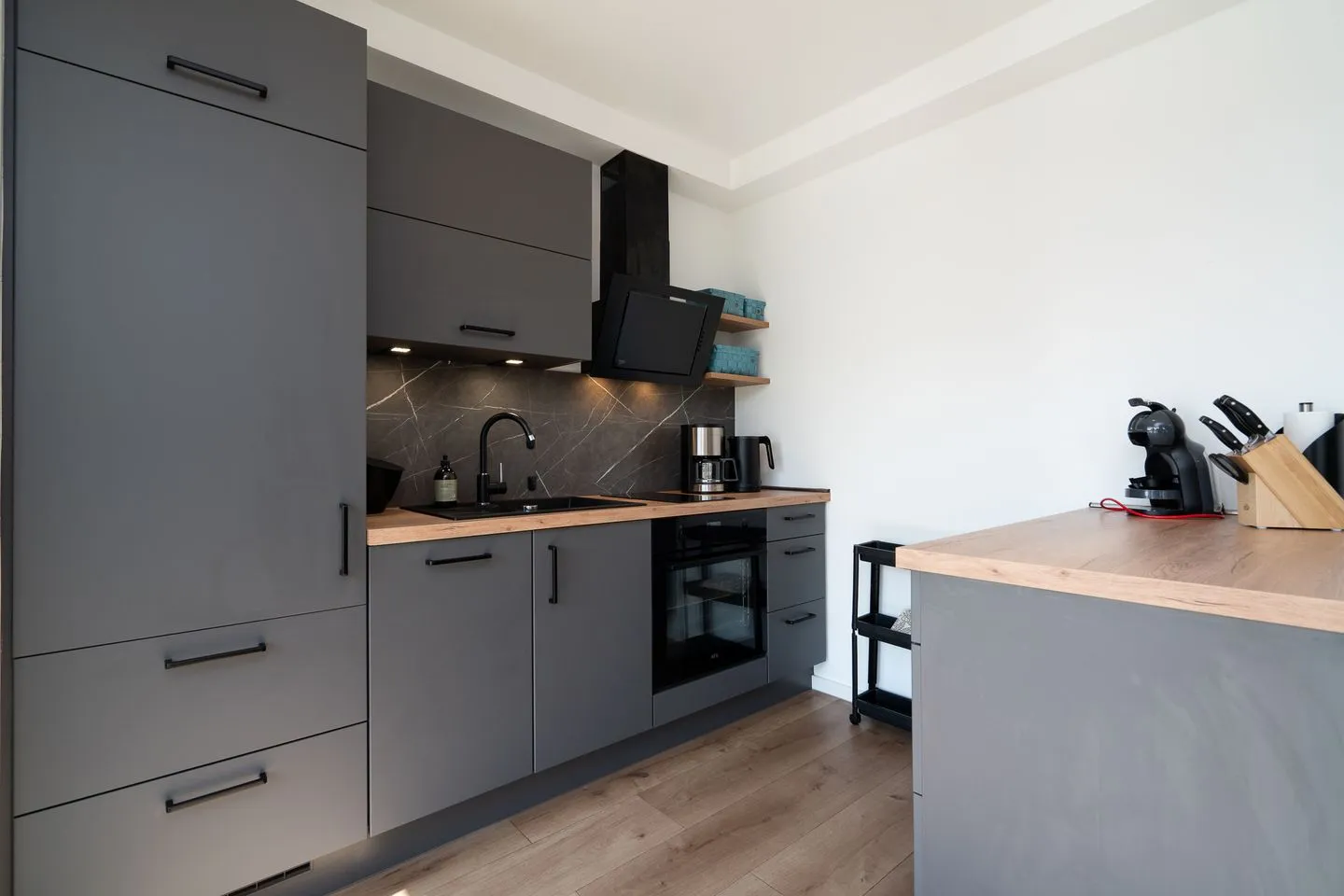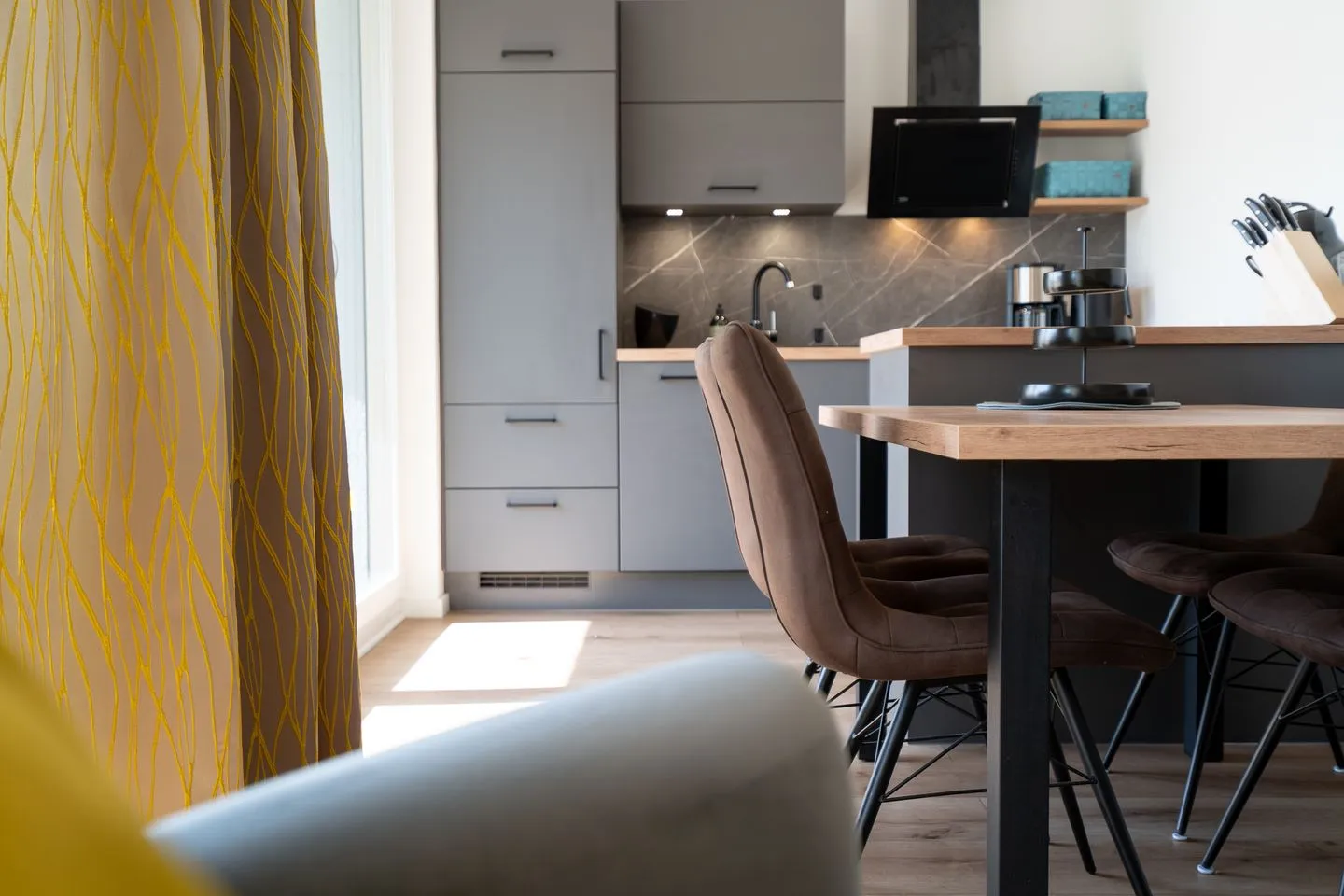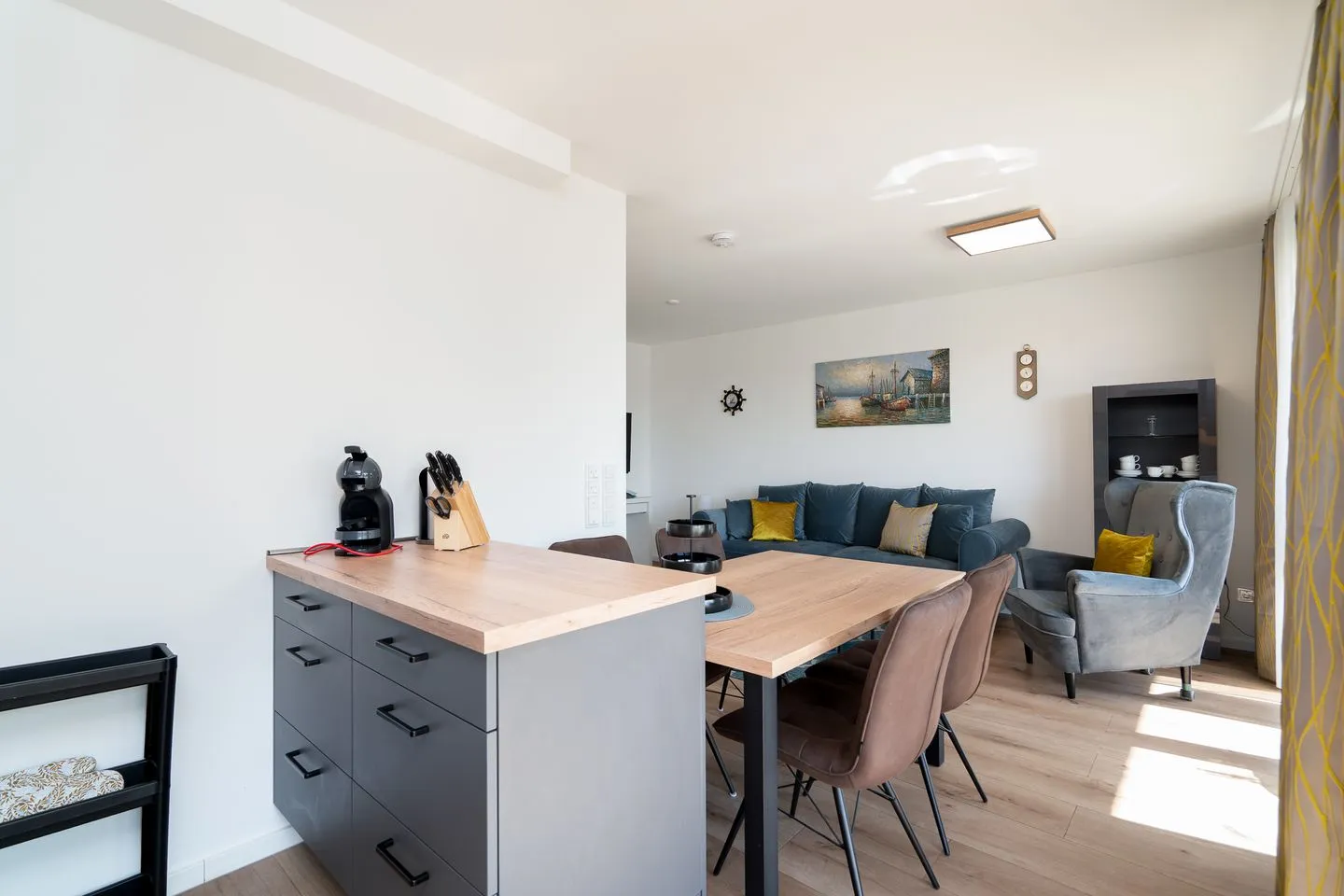 Die moderne Wohnung verfügt über einen offenen Küchenbereich, der perfekt in das Wohnzimmer integriert ist. Die Küche ist umfassend ausgestattet und an moderne Standards angepasst. Sie finden hier einen Herd, Backofen, Kühlschrank und Geschirrspüler. Für gesellige Runden steht Ihnen ein Esstisch zur Verfügung, während die Sofaecke im Wohnzimmer mit einer bequemen Sitzecke und einem Fernseher mit Zugang zu verschiedenen Programmen zum Entspannen einlädt. WLAN und ein Radio sind ebenfalls vorhanden, um sicherzustellen, dass Sie mit der Außenwelt verbunden sind oder einfach Ihre Lieblingsmusik genießen können. Im Schlafzimmer sorgt ein komfortables Boxspringbett für erholsamen Schlaf. Bitte beachten Sie, dass die Schlafzimmertür nicht ganz zu geht. Auf dem Sofa mit Schlaffunktion im Wohnzimmer ist Platz für zwei weitere Personen. Das Badezimmer ist modern gestaltet und hat eine bodengleiche Dusche, ein Waschbecken, ein WC, sowie einen Haartrockner.