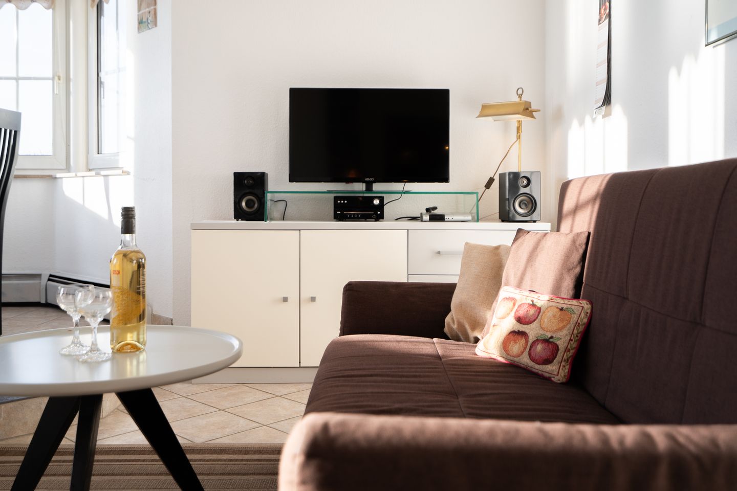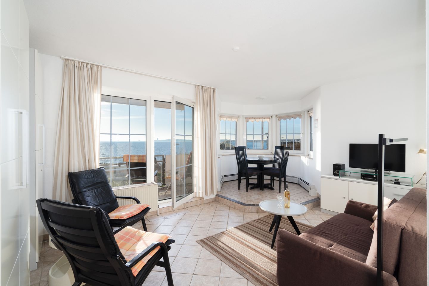 Das Apartment besteht aus einem Wohnraum mit erhöhter Essecke im Erker, diese bietet einen schönen Blick aufs Wasser. Im Wohnbereich steht ein TV-Gerät, dazu passend 2 Sessel und eine Couch, diese kann zu einer Schlafcouch umgewandelt werden, es können hier 2 Personen schlafen. ( 140 x 190 cm ). Es gibt einen extra Schlafraum mit zwei Einzelbetten (jeweils 80 x 200 cm) und Fenster. Die Küchenzeile ist offen zum Wohnbereich hin. Das Bad ist geräumig mit Dusche, WC und Waschbecken. Die Wohnung ist durchgehend gefliest.